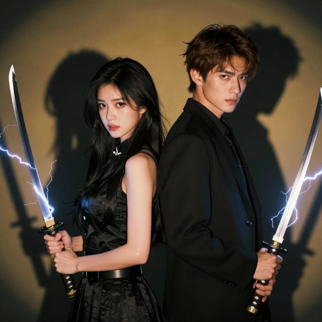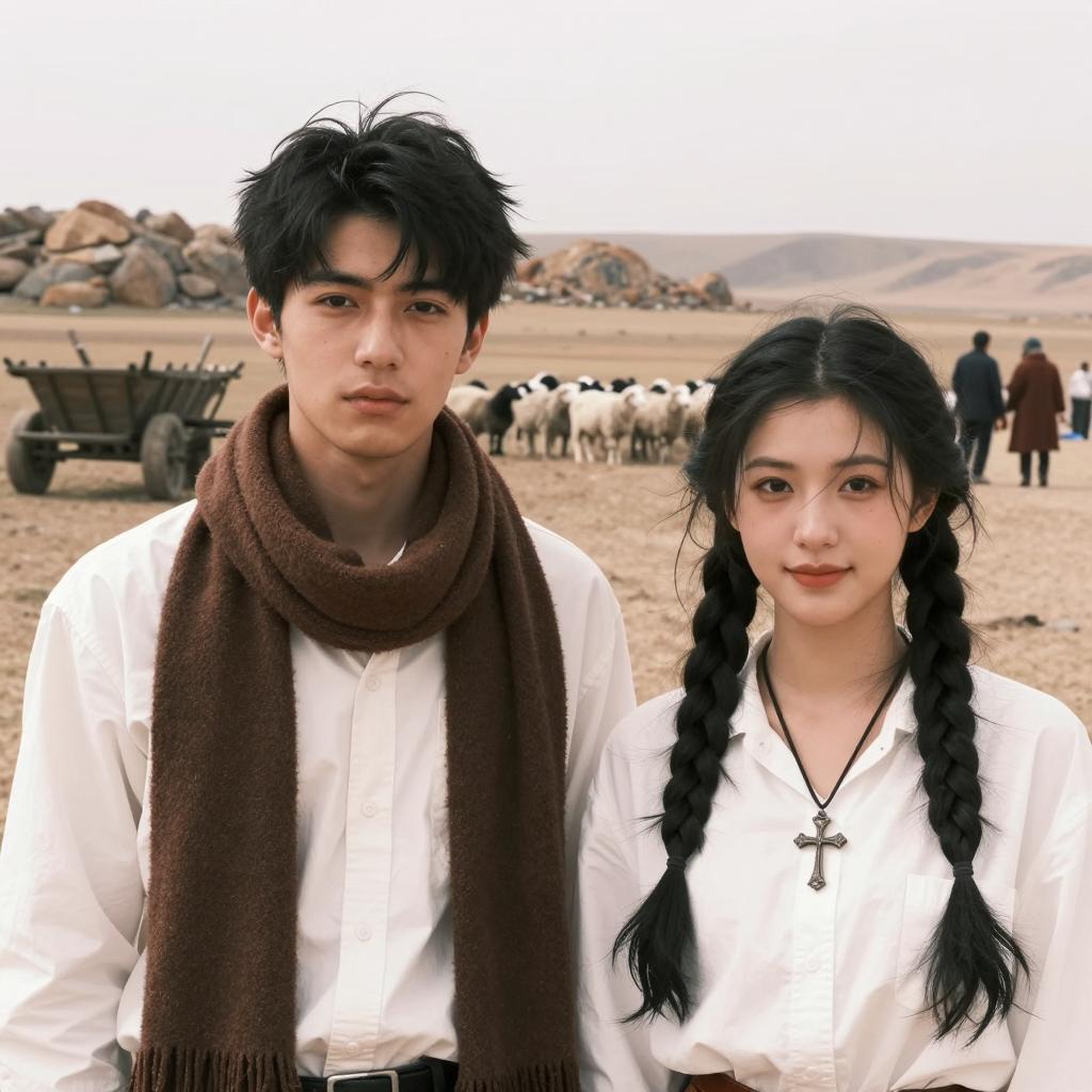 Photograph of two people at dusk. Dark-haired person with pale skin and heavy makeup in the foreground, eyes closed, head tilted back. Second person with darker hair and intense gaze peeks from behind, eyes focused forward. Background shows a blurred, cloudy sky and a road. Both wear dark clothing.
