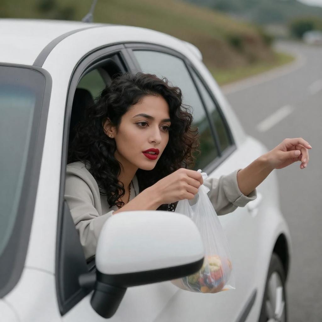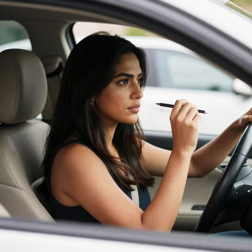 Photograph of a woman with long dark hair, brown eyes, and light brown skin, sitting in a car's driver seat. She holds a pen in her right hand, looking to the right with a serious expression. She wears a sleeveless dark top and gold earrings. The car's interior is beige, with a black steering wheel. The car window is partially open.