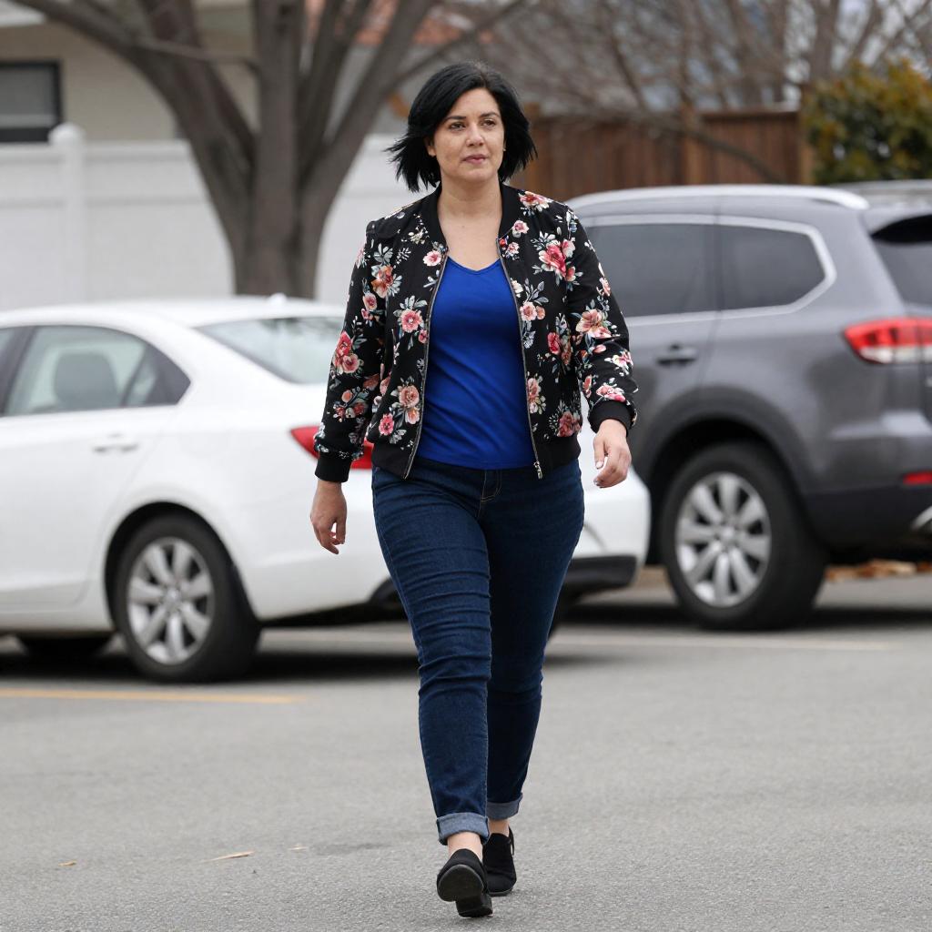 Photograph of a woman with short black hair, wearing a black floral jacket, blue top, and dark jeans, walking on a suburban street. She has a medium build and light skin. Behind her are parked cars, including a white sedan and a gray SUV, with leafless trees and a white fence in the background.