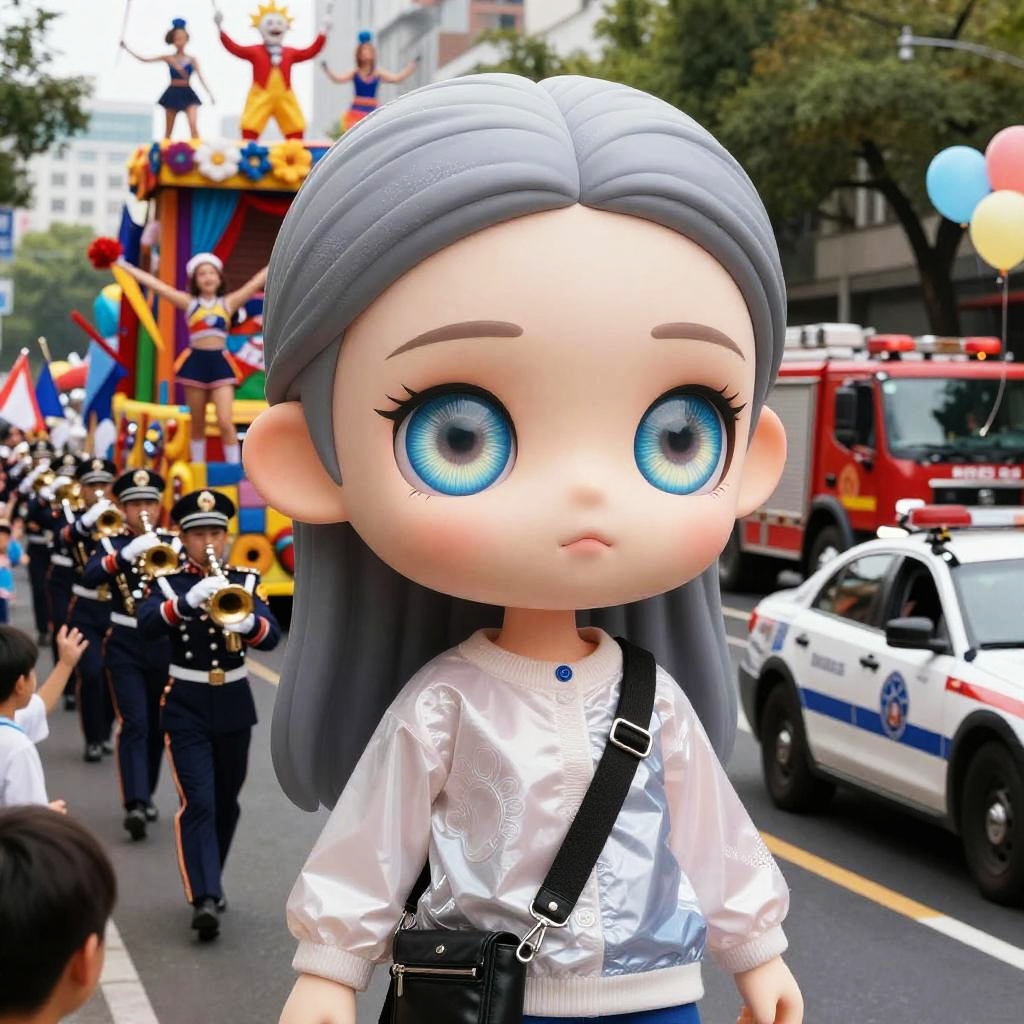 Photorealistic CGI of a large-eyed, gray-haired doll with silver hair, white blouse, and black suspenders, amidst a colorful parade with police