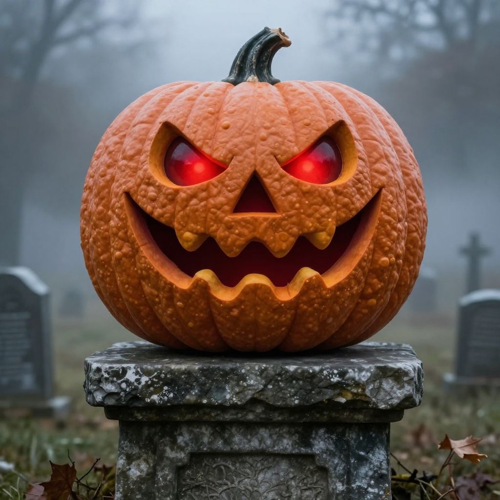 Giant monster face pumpkin with exaggerated features, spooky grin and glowing red eyes, set on ancient stone pedestal, foggy graveyard backdrop, dramatic lighting