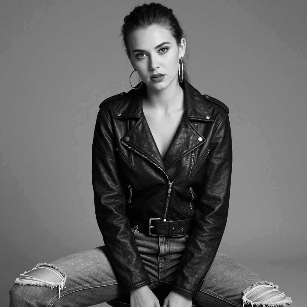 This striking black and white portrait features a confident young woman in a stylish leather jacket, exuding a sense of modern edginess. Her bold look is complemented by ripped jeans and statement hoop earrings, embodying contemporary fashion trends.