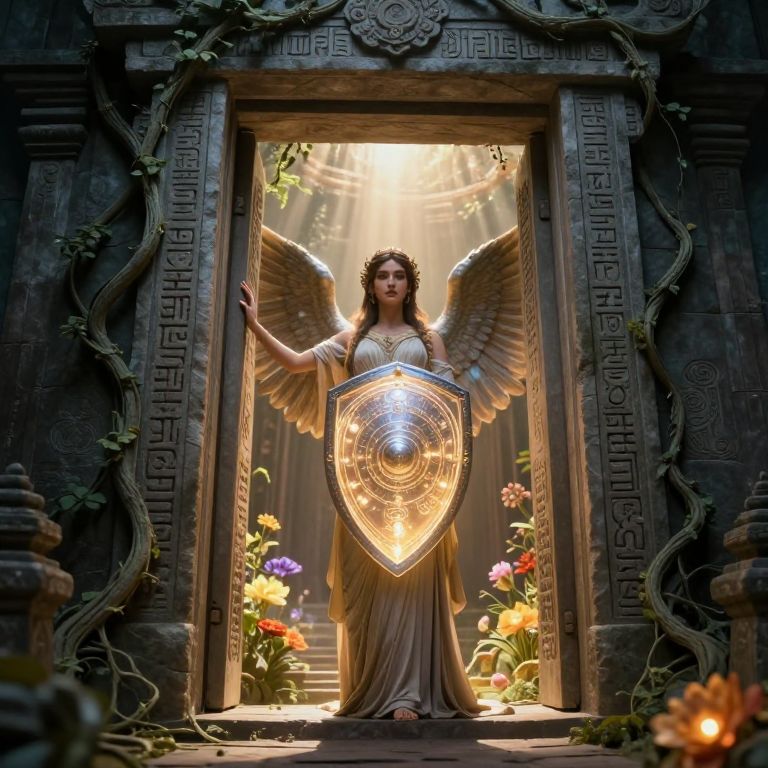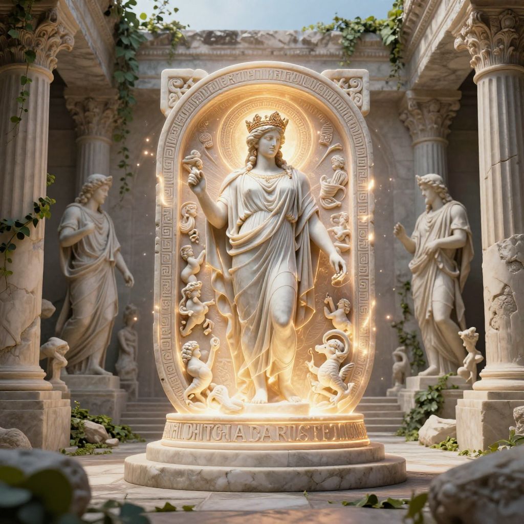 Greek gods name generator represented by a glowing ancient Greek artifact, radiating magical light amidst marble ruins and ivy, intricate carvings of gods and mythical creatures, surrounded by a divine aura, high-resolution mythological fantasy scene