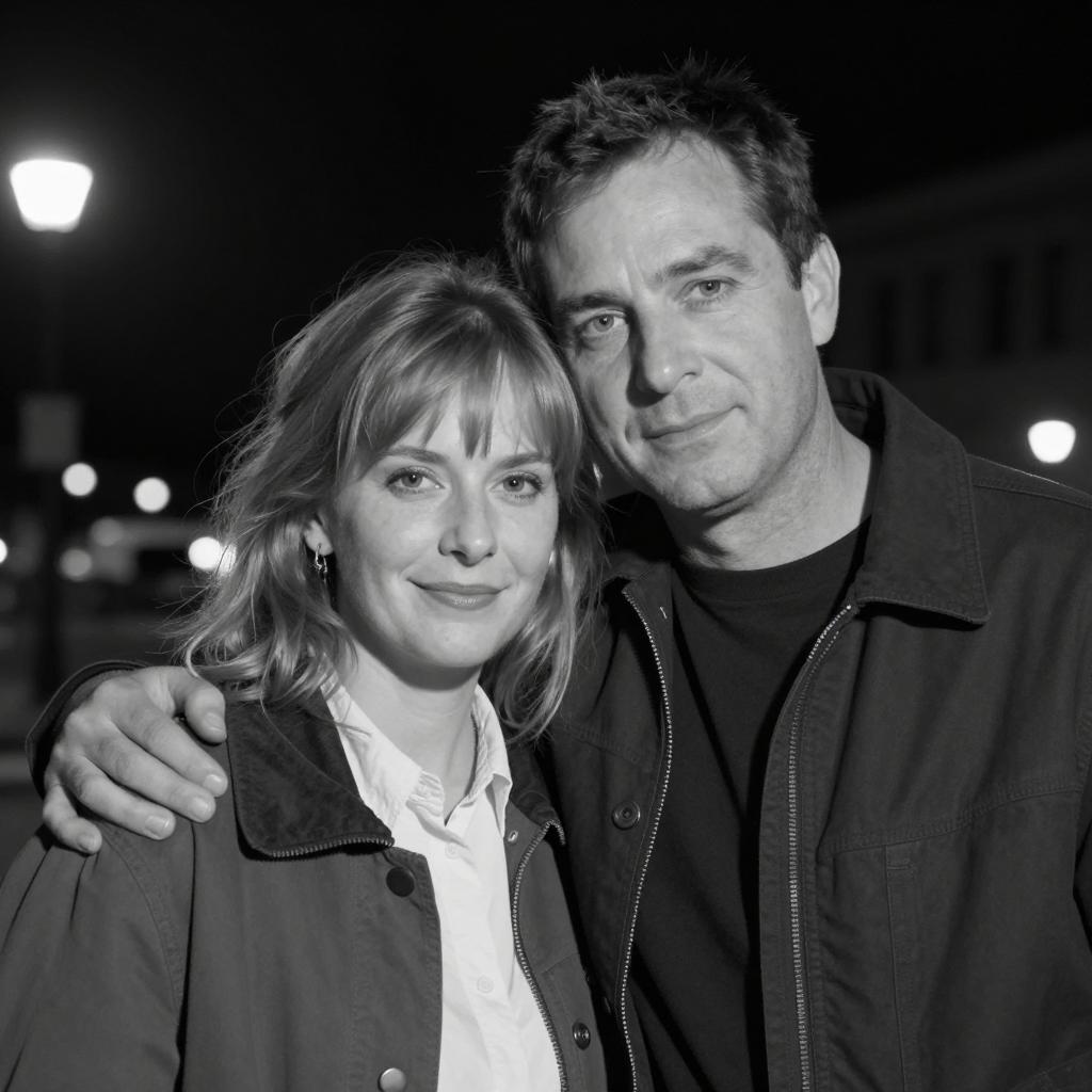 Black-and-white photograph of a man and woman with close-cropped hair, standing closely together. Man on the left with short, dark hair and slight smile, woman on the right with light hair and subtle smile. Blurred city lights in the background. Both wearing dark clothing. Woman's eyes slightly squinted.