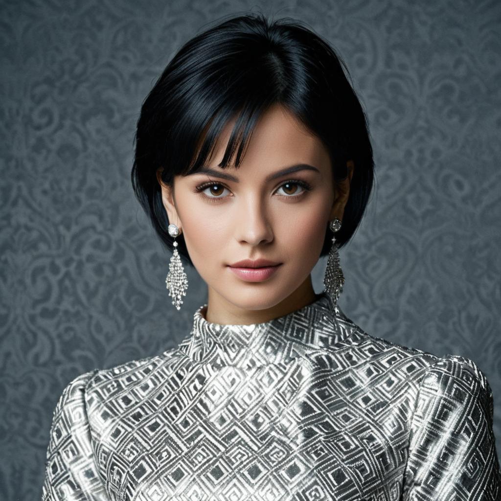 Portrait of an elegant woman with short black hair wearing a silver jacquard dress with geometric patterns and long sleeves. She accessorizes with long, sparkling silver earrings and subtle makeup, standing against a textured grey background.