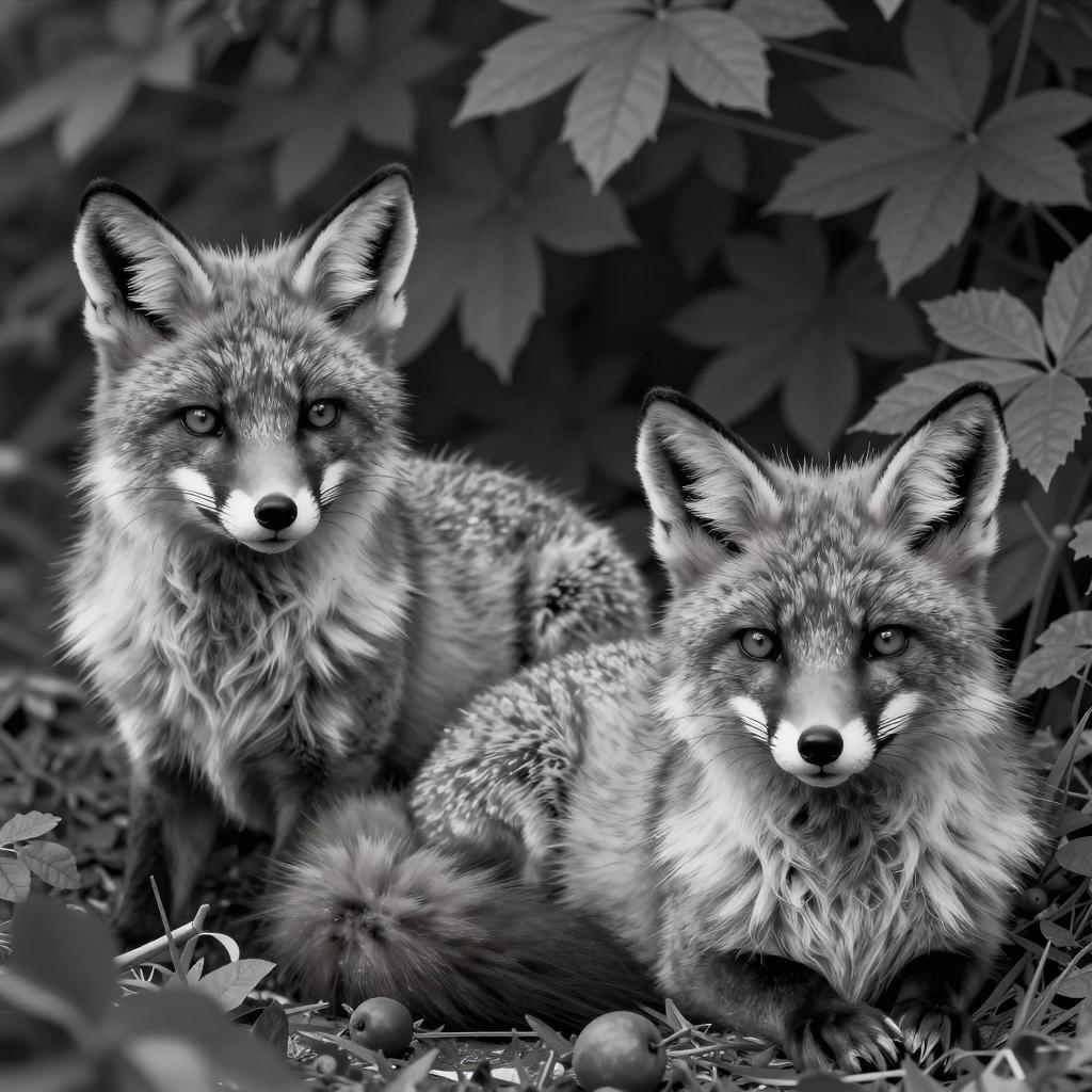 Close-up photograph of a large gray and brown adult wolf with closed eyes, embracing a small reddish-brown fox cub with closed eyes. Both animals have soft, fluffy fur. Background is blurred, showing indistinct trees. Adult wolf's nose touches the fox cub's nose. Fox cub's head rests on the wolf's neck.