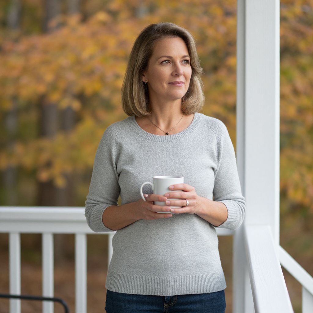 Mature woman standing with mug on front porch in autumn looking relaxed and happy, tips for simple stress-free fall
