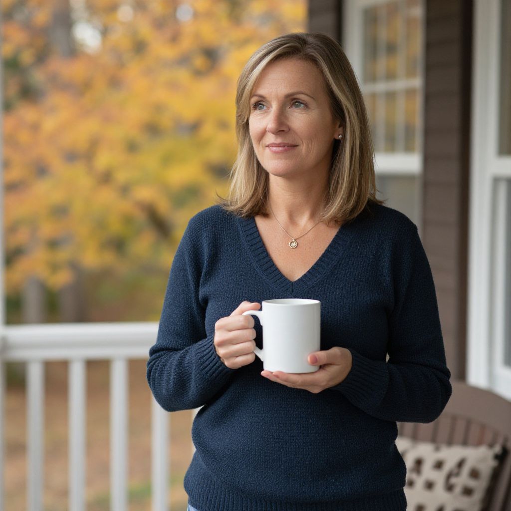 Photograph of a smiling middle-aged woman with shoulder-length blonde hair, wearing a navy blue sweater, holding a white mug, standing on a porch with