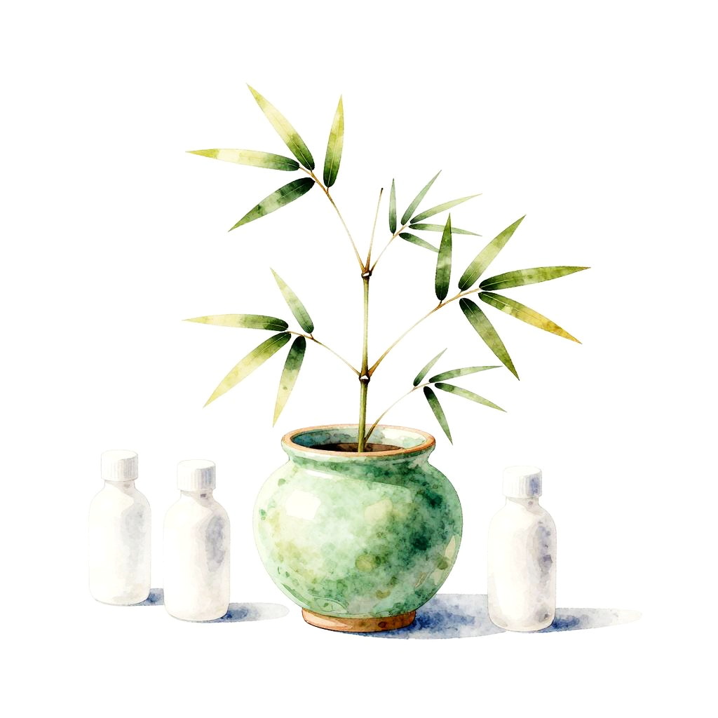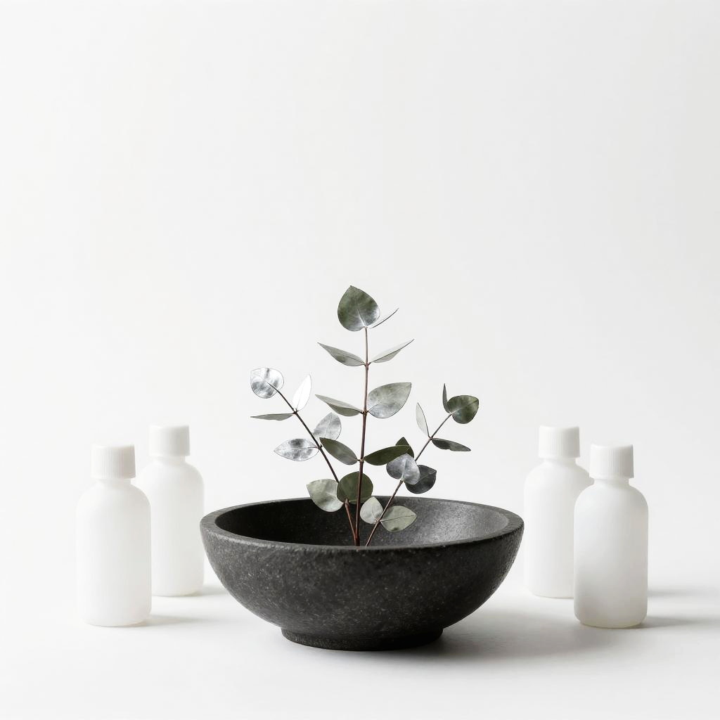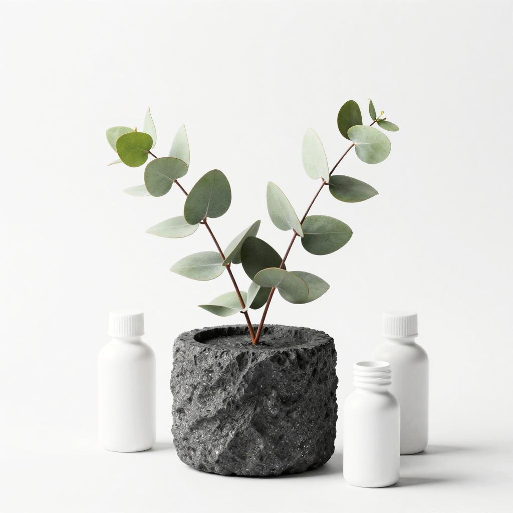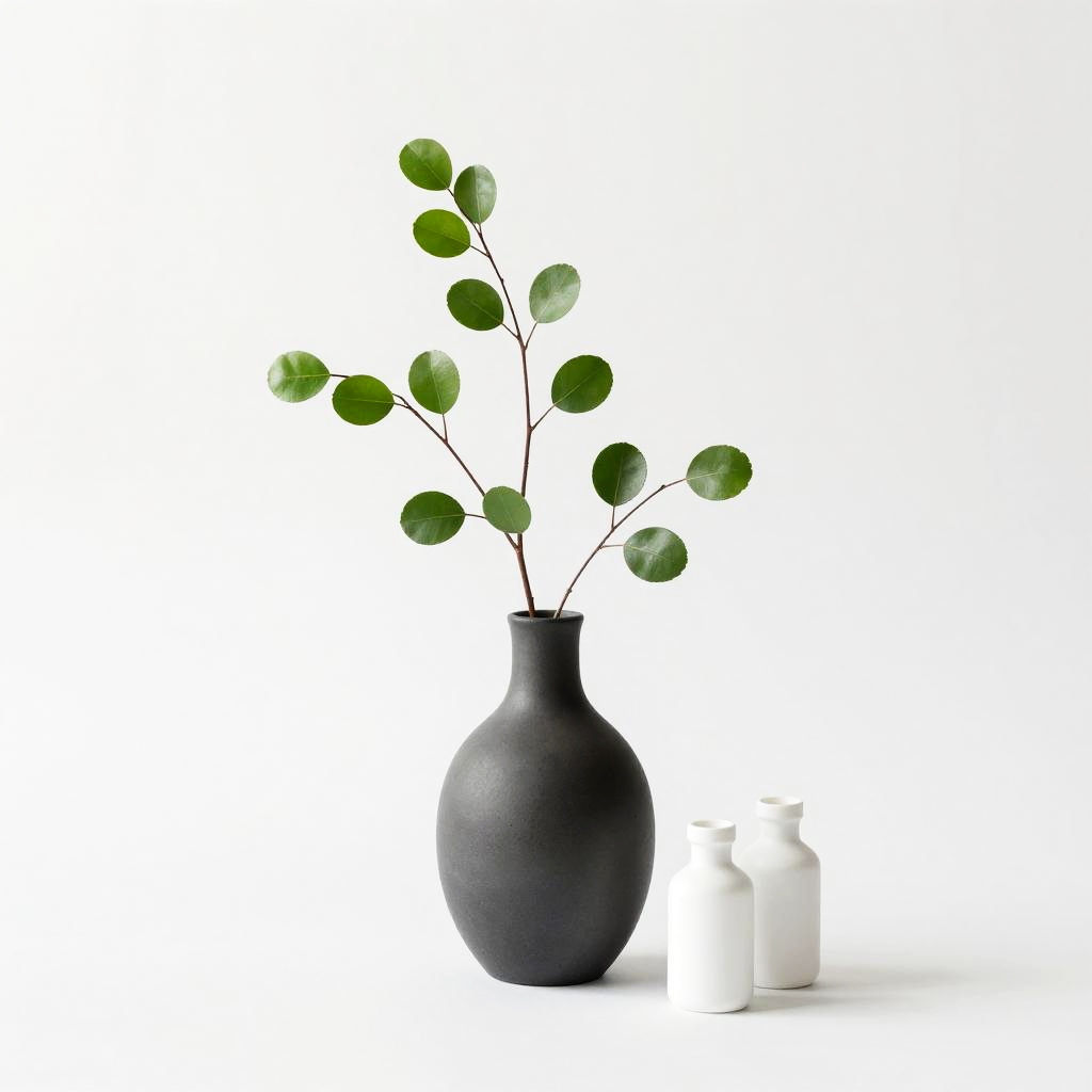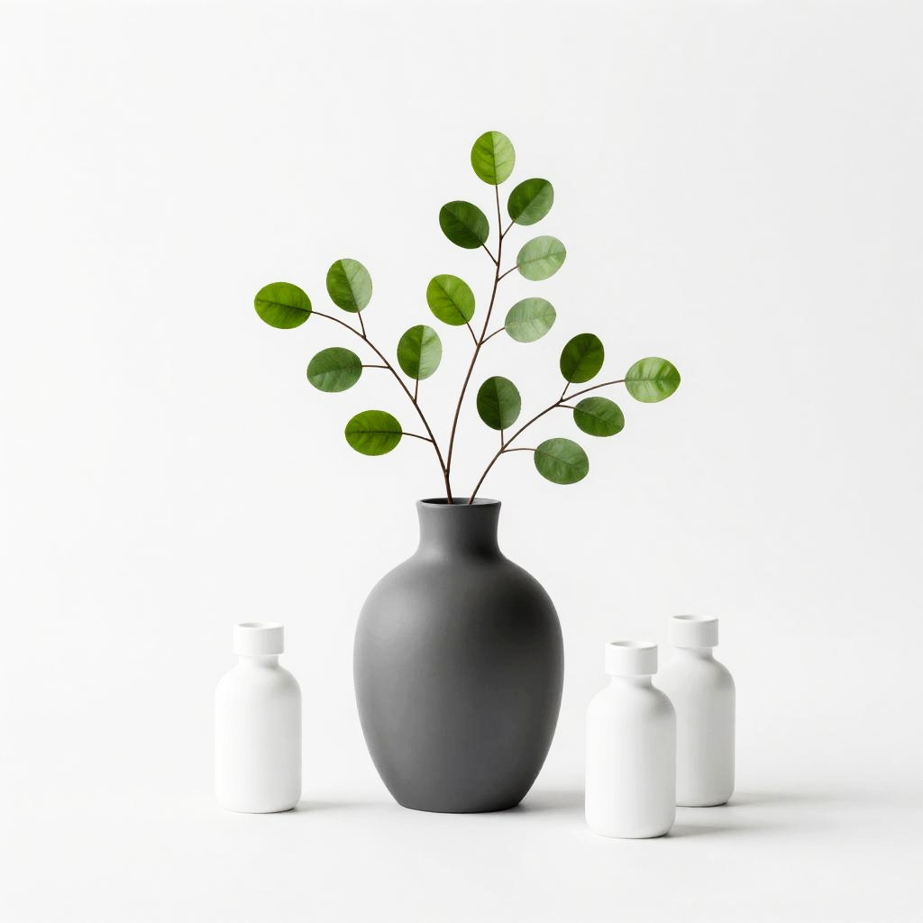 A clean digital crosshatch drawing featuring a matte dark gray asymmetrical vase holding a sparse cluster of small round green leaves, on a seamless white background with three small empty white bottles nearby; high contrast, bold accent colors, thin clean lines, balanced composition, generous negative space, soft studio lighting, modern minimalist aesthetic, crisp edges, no text, no watermark