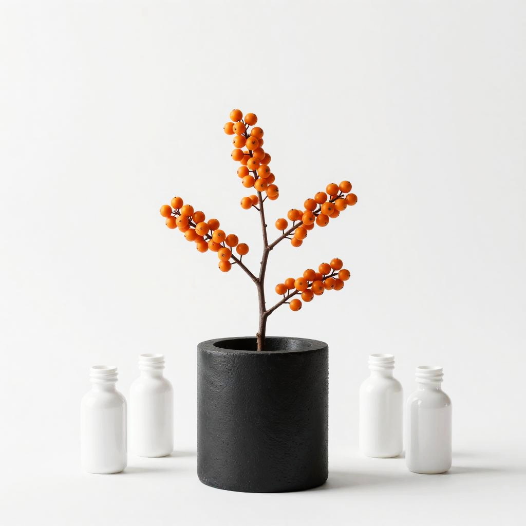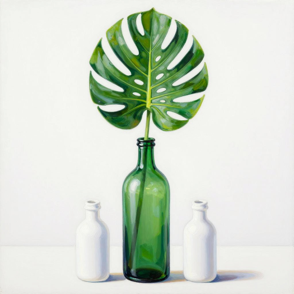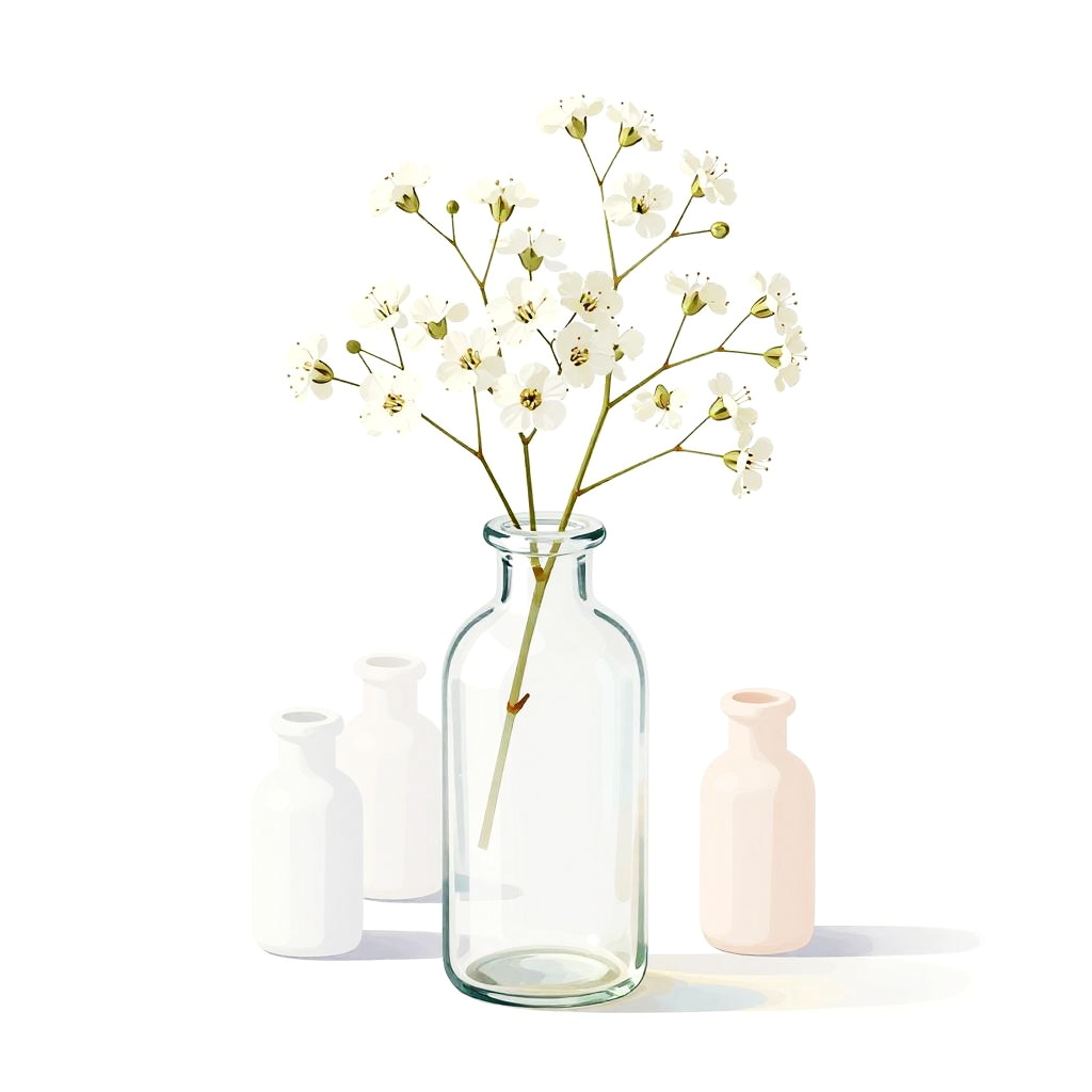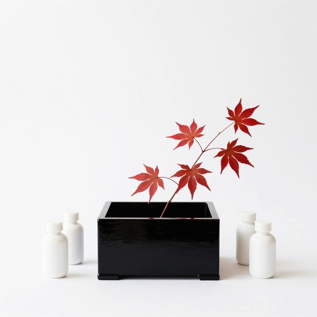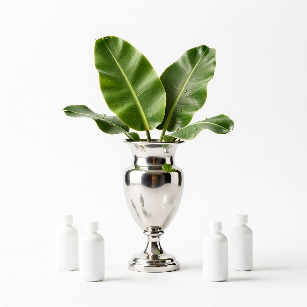 A clean digital crosshatch drawing featuring a matte dark gray asymmetrical vase holding a sparse cluster of small round green leaves, on a seamless white background with three small empty white bottles nearby; high contrast, bold accent colors, thin clean lines, balanced composition, generous negative space, soft studio lighting, modern minimalist aesthetic, crisp edges, no text, no watermark