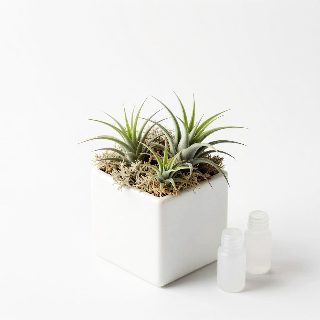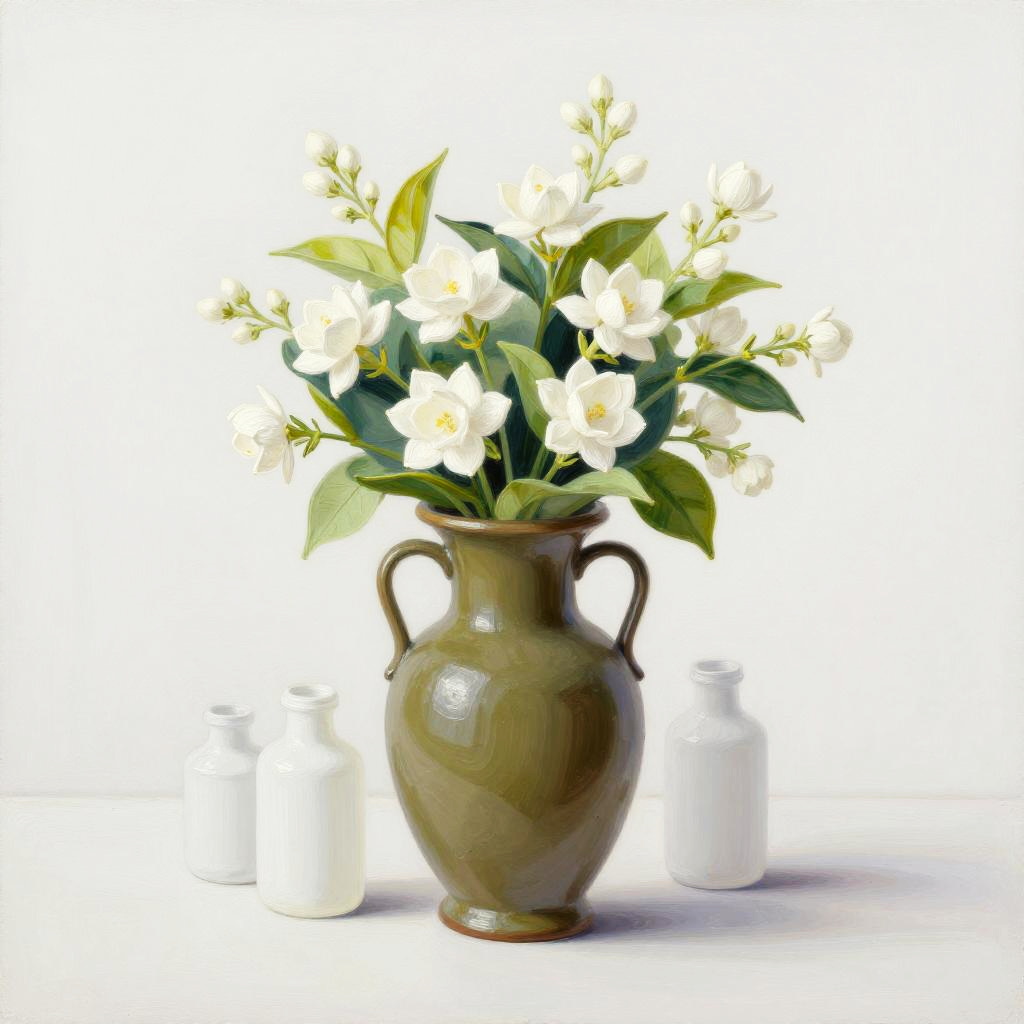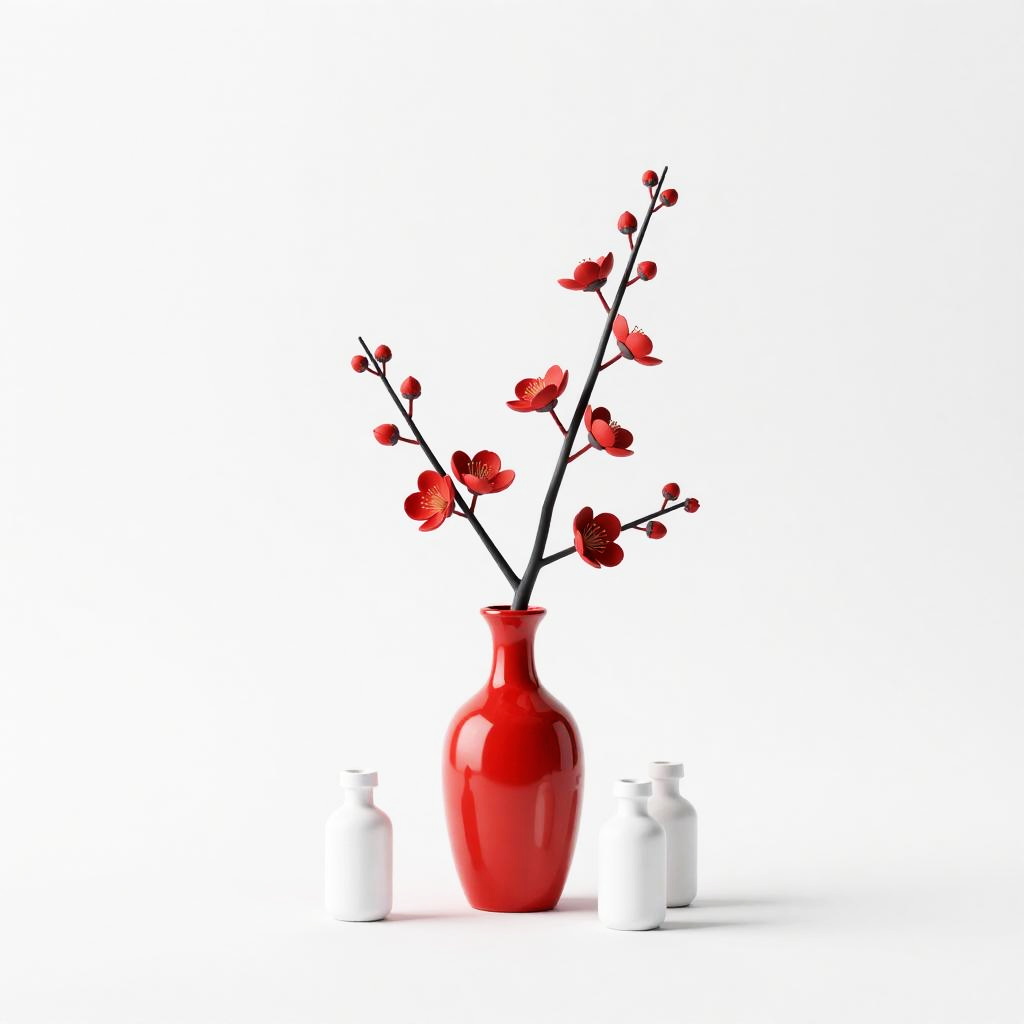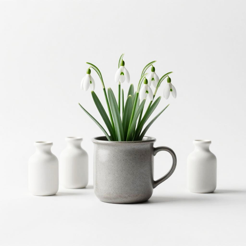 A clean digital crosshatch drawing featuring a matte dark gray asymmetrical vase holding a sparse cluster of small round green leaves, on a seamless white background with three small empty white bottles nearby; high contrast, bold accent colors, thin clean lines, balanced composition, generous negative space, soft studio lighting, modern minimalist aesthetic, crisp edges, no text, no watermark