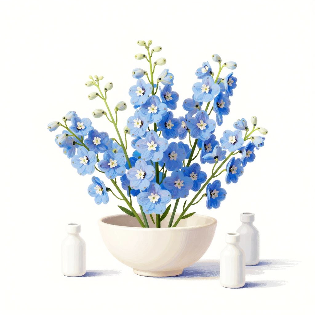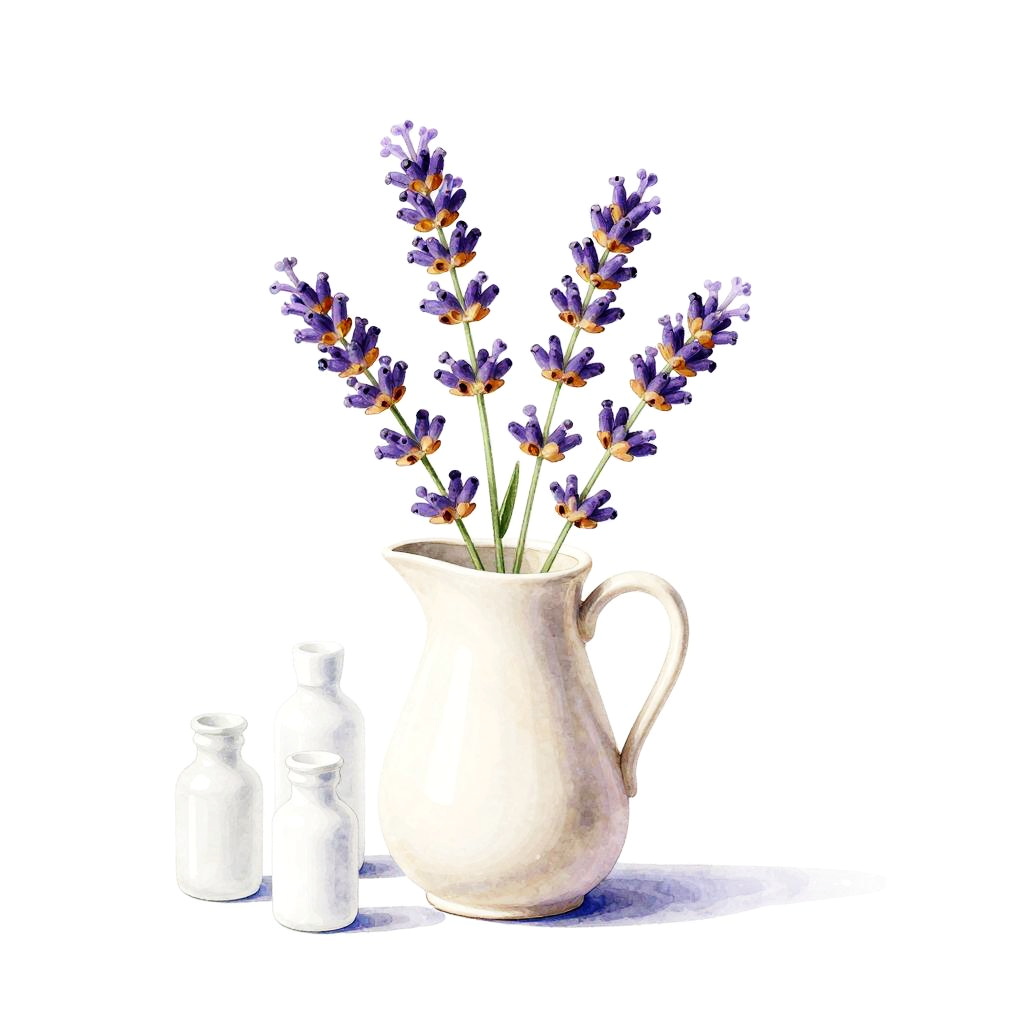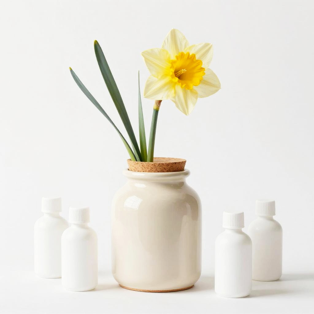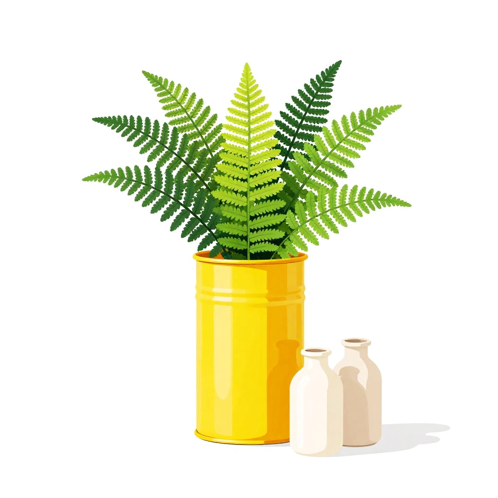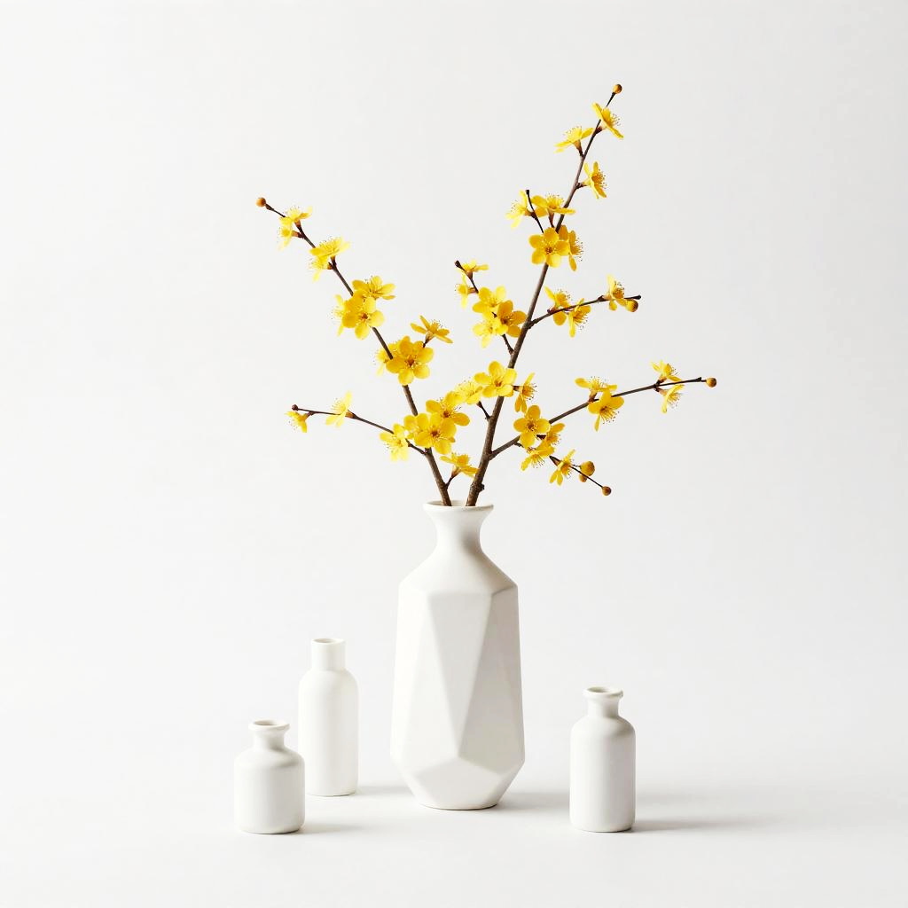 A clean digital crosshatch drawing featuring a matte dark gray asymmetrical vase holding a sparse cluster of small round green leaves, on a seamless white background with three small empty white bottles nearby; high contrast, bold accent colors, thin clean lines, balanced composition, generous negative space, soft studio lighting, modern minimalist aesthetic, crisp edges, no text, no watermark