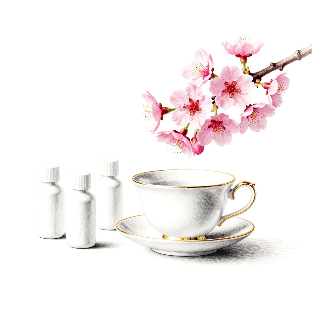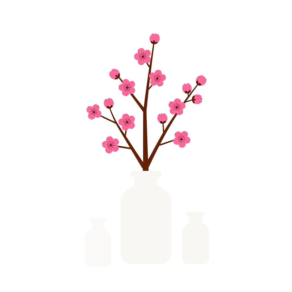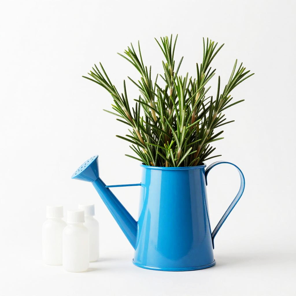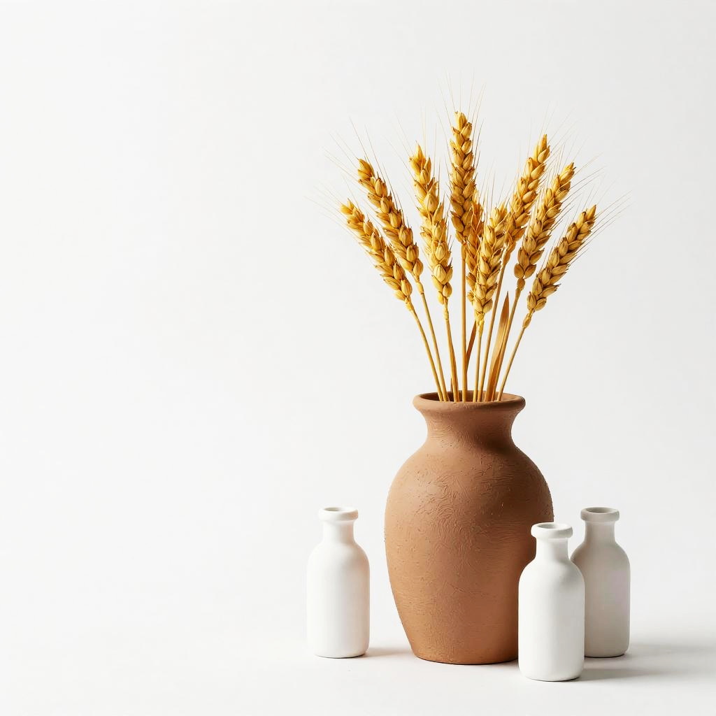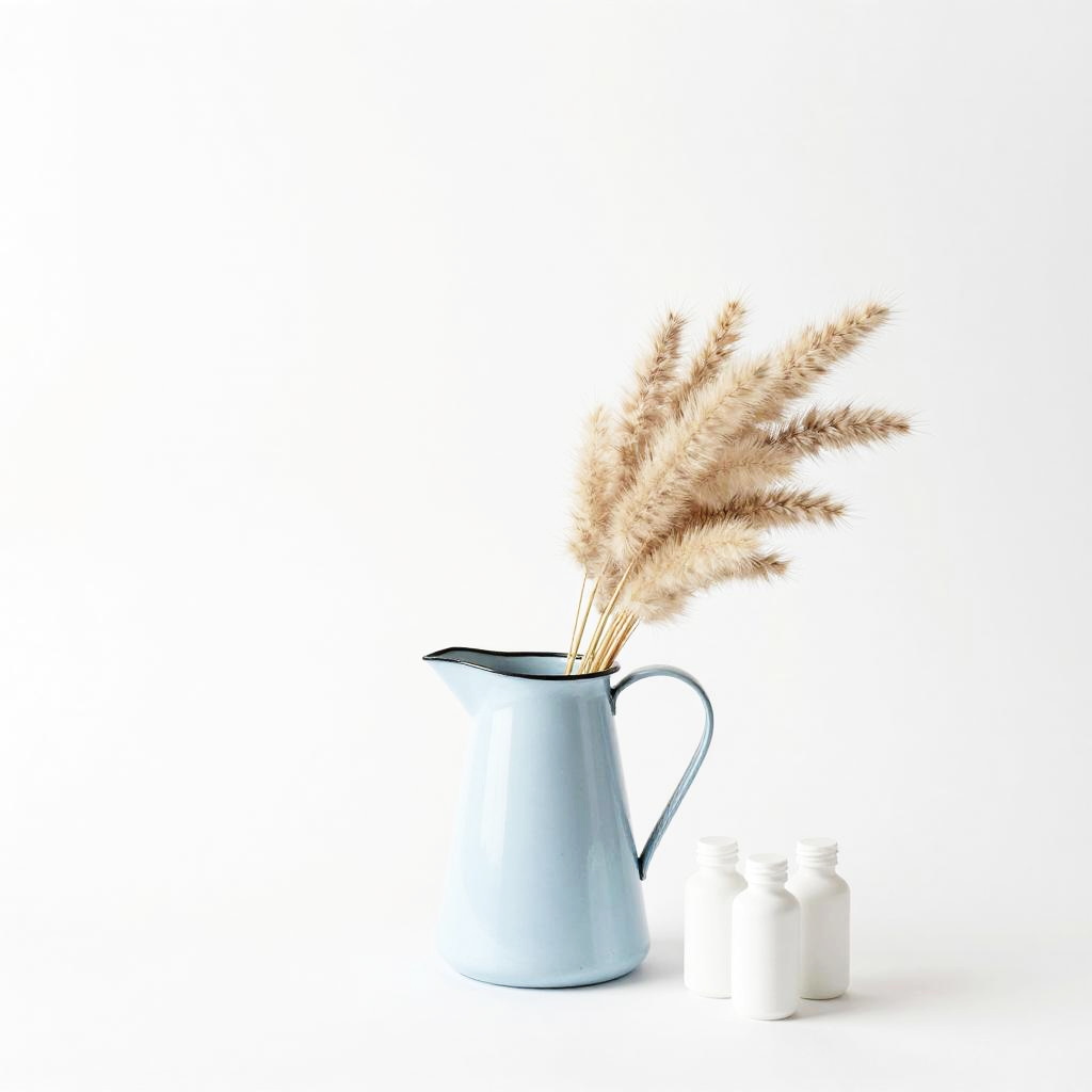 A clean digital crosshatch drawing featuring a matte dark gray asymmetrical vase holding a sparse cluster of small round green leaves, on a seamless white background with three small empty white bottles nearby; high contrast, bold accent colors, thin clean lines, balanced composition, generous negative space, soft studio lighting, modern minimalist aesthetic, crisp edges, no text, no watermark