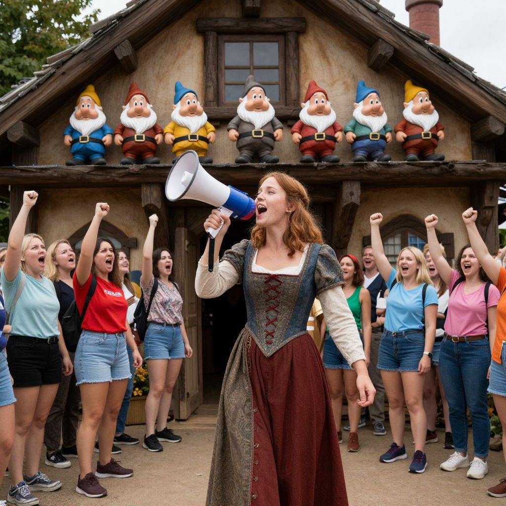 A woman in a medieval dress leads a #MeToo protest in front of the Seven Dwarfs' cottage, with a megaphone and a crowd of women shouting and pumping fists.