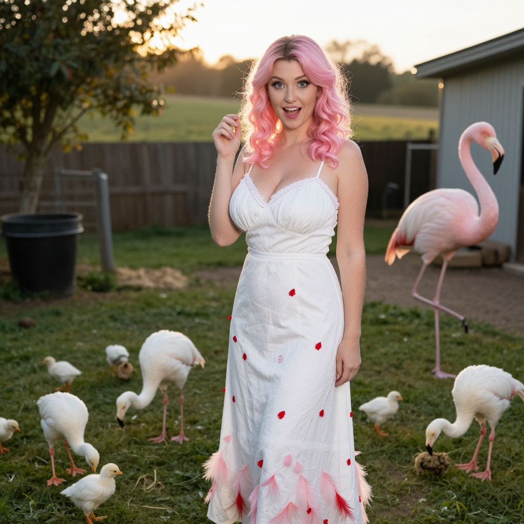 A tall, graceful woman in a detailed white flamingo dress with tiny red and pink feather details, wearing a playful expression, fair skin, bright blue eyes, and curly pink highlights in her hair, standing in a countryside farmyard where white chicks peck at the grass around her, golden hour lighting, realistic outdoor scene. The woman has big tits and cute face