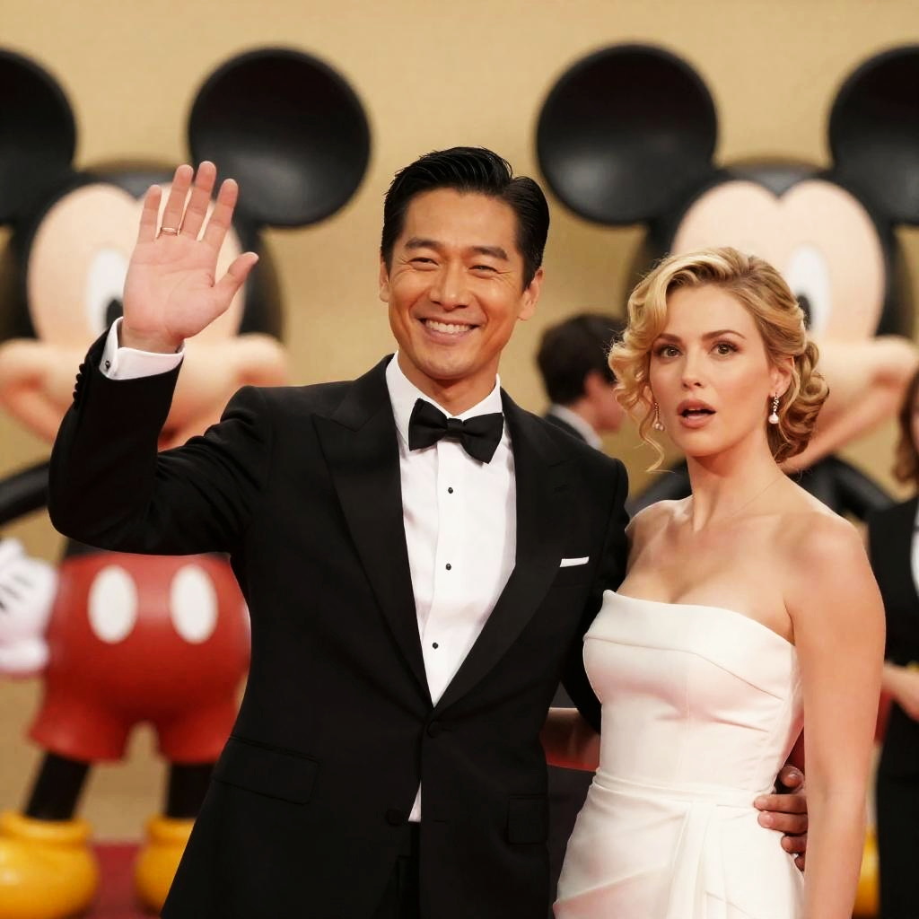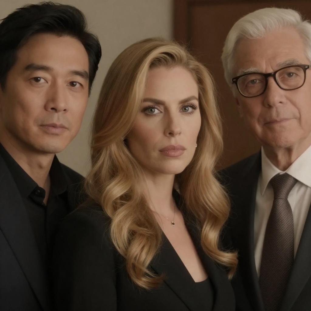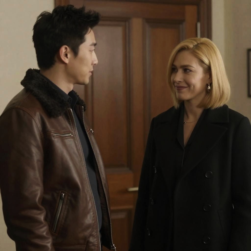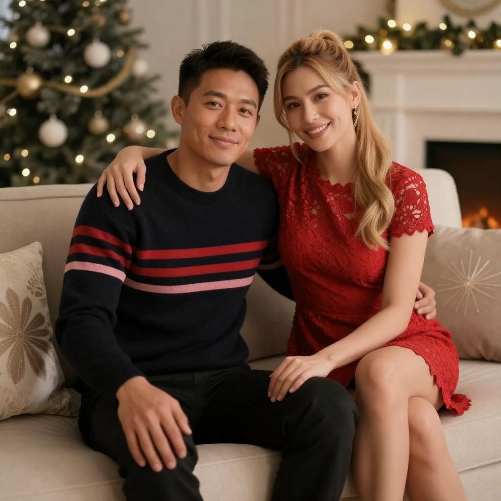 Photograph of a blonde woman with wavy hair, wearing a blue coat, smiling, standing next to a man with dark hair. Background includes Christmas decorations, a black music stand, and "Merry Christmas" sign. Woman in center, man on left. Christmas ornaments and green garland visible. Woman's earrings and man's slight smile visible.