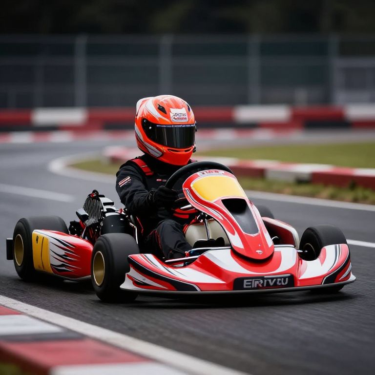 Photograph of a red and white karts racing on a track, driver in matching helmet and suit, blurred background.