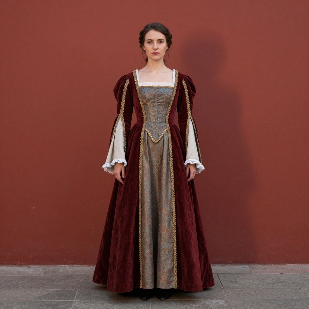 Female Larp Costume, woman in a renaissance dress standing in front of a red wall
