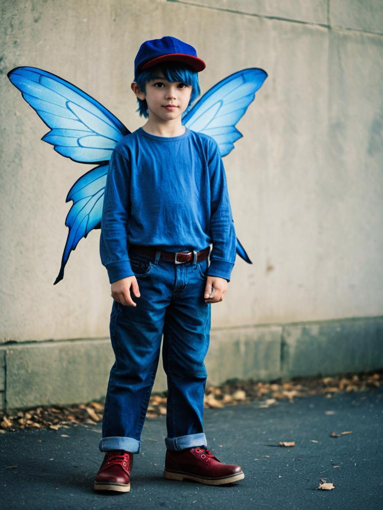 Full body portrait of a young boy wearing a blue long sleeve shirt, blue pants, and red shoes standing outdoors against a beige wall. He has blue hair, blue fairy wings attached to his back, and wears a blue and red cap. The boy is looking directly at the camera with a neutral expression, with his hair partially covering one eye.