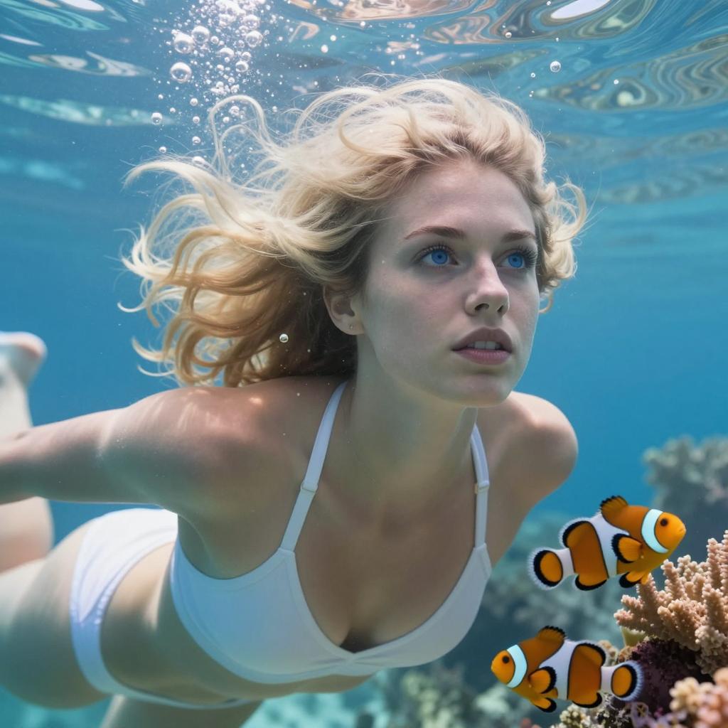Underwater photo of a blonde woman with blue eyes and wavy hair wearing a white swimsuit. She is swimming near colorful coral reefs with two clownfish nearby. Sunlight filters through clear blue water, illuminating her face and hair with bubbles around her.