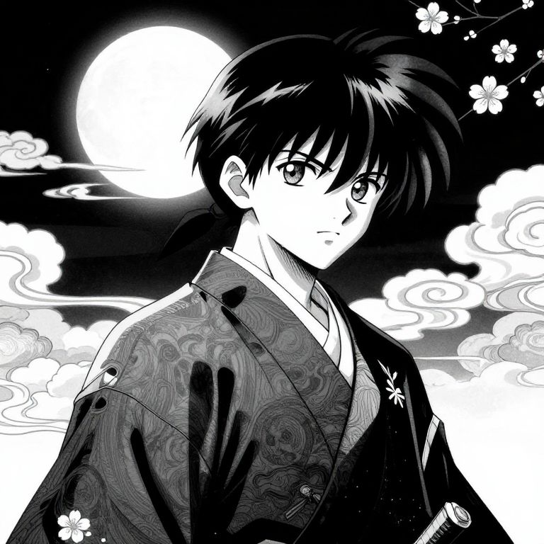 Anime-style black-and-white drawing of a serious young man with dark hair, wearing a patterned kimono, against a full moon and clouded night