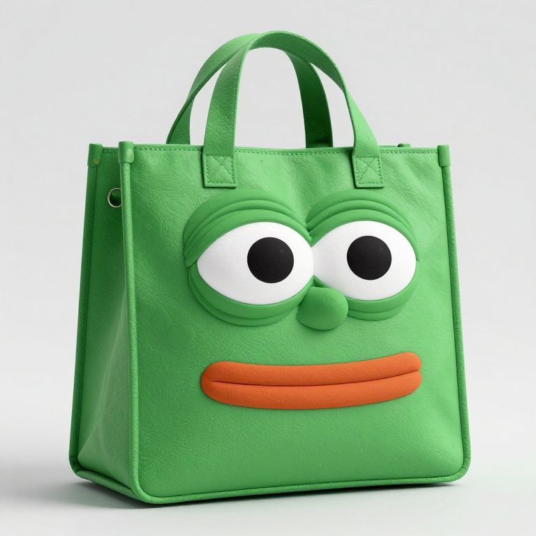 A green, post-apocalyptic bag with a Pepe-like face, large eyes, and a wide smile.