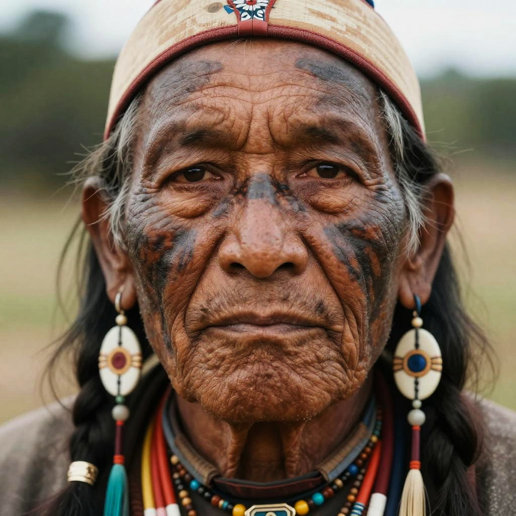 Close-up portrait of an Indio Cherokee elder with facial paint, intense gaze, detailed wrinkles, traditional jewelry, set against a natural backdrop, rich textures