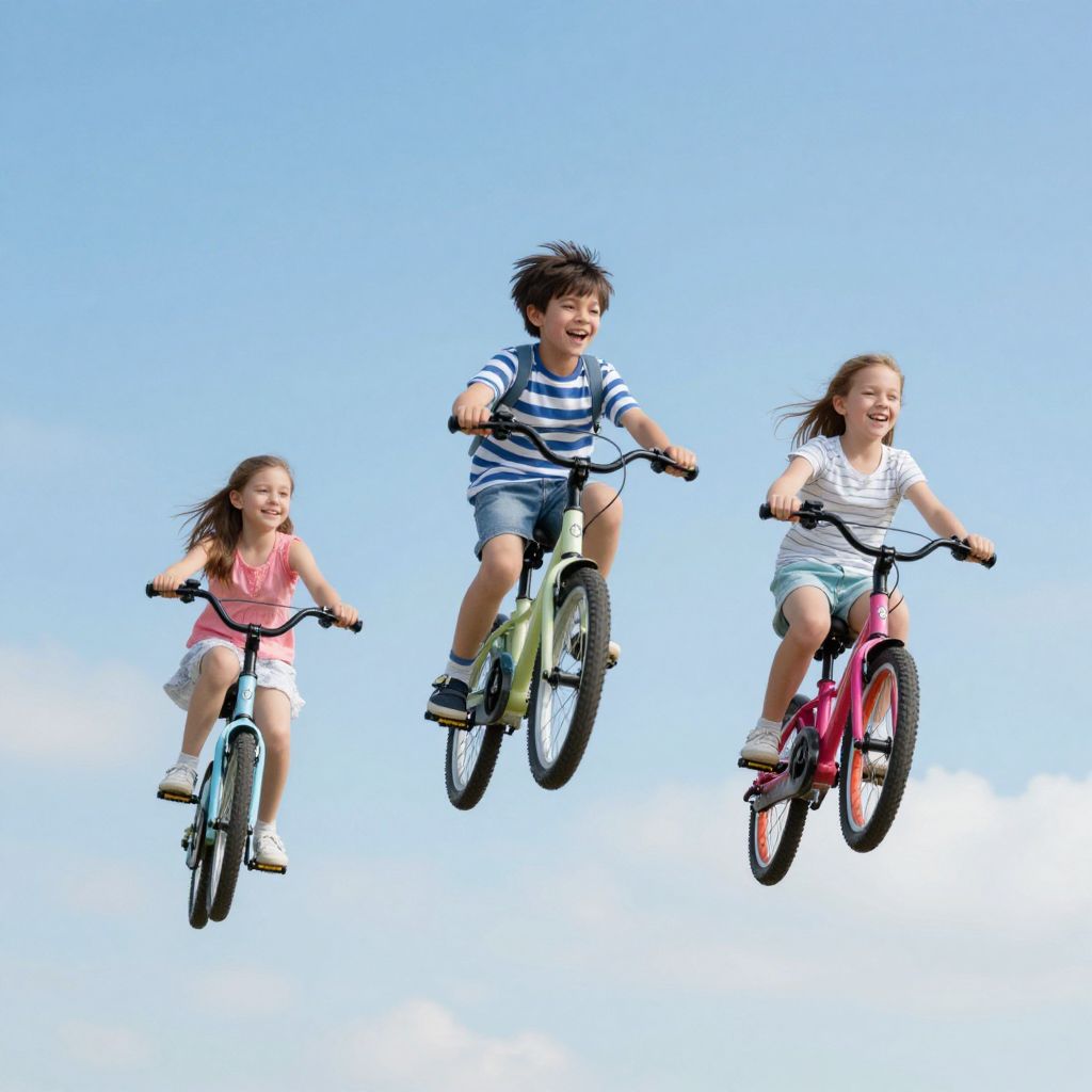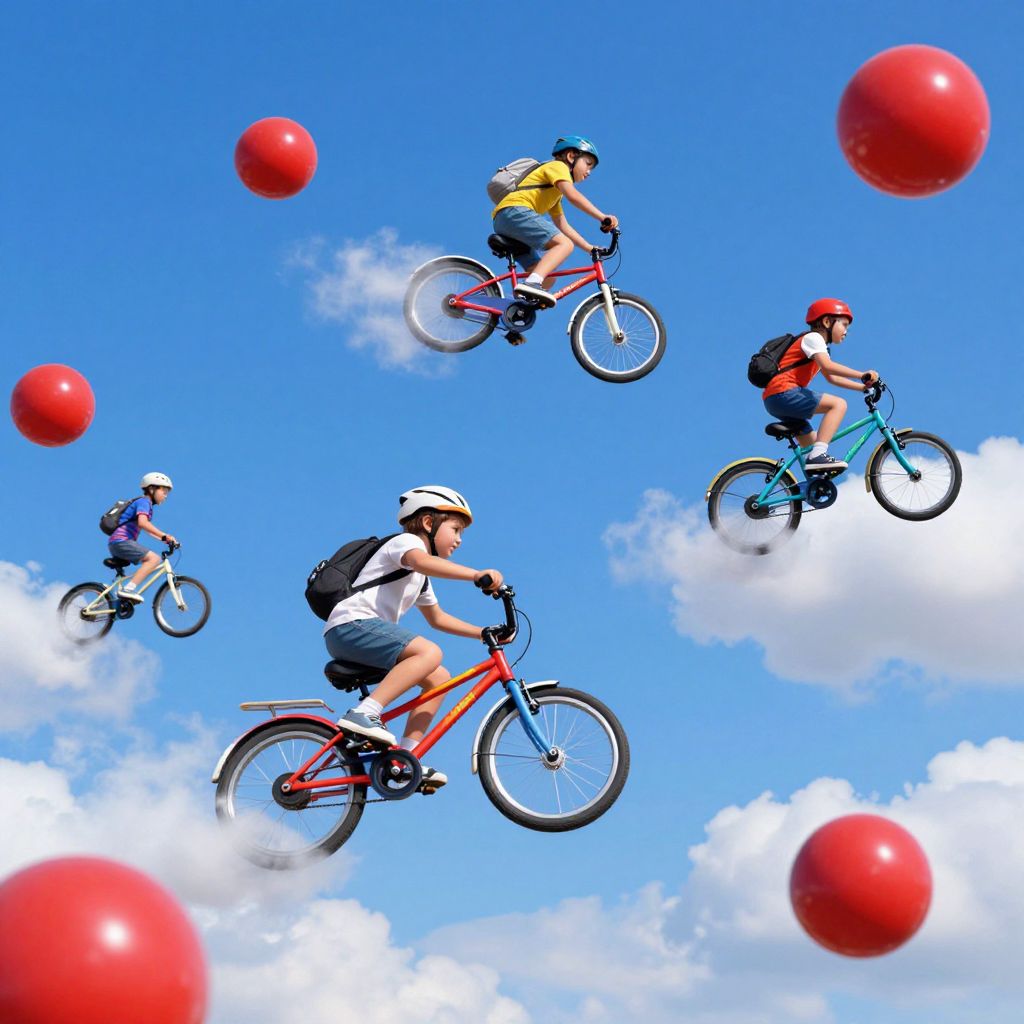 Through a whimsical sky highway, children defy gravity on inverted bicycles, their laughter echoing beneath question-mark clouds, symbolizing boundless curiosity and the exhilarating pursuit of answers in a world of endless wonder.