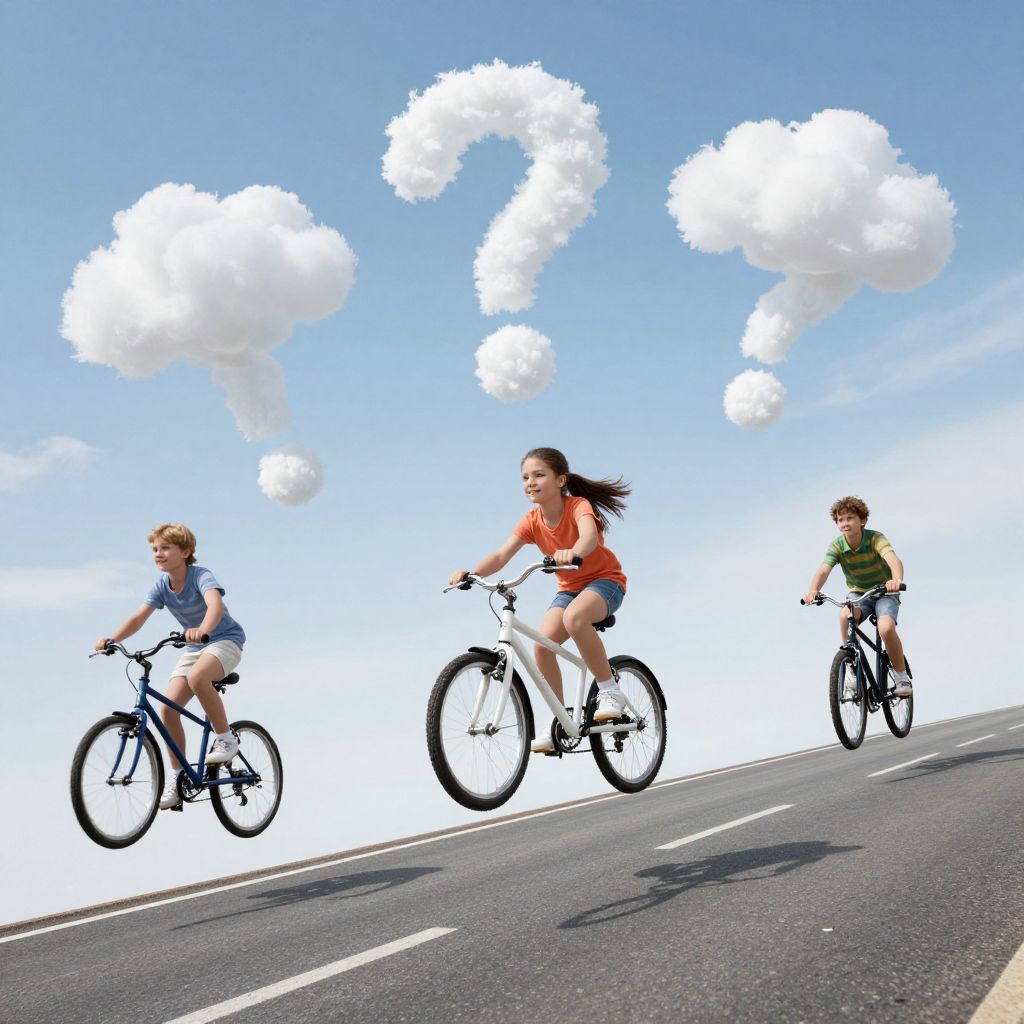Photograph of three children riding bicycles on a road with questioning cloud icons above them, wearing helmets and backpacks, under a clear blue sky.