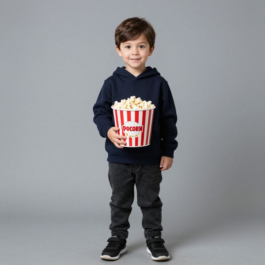 "bucket popcorn toddler, solo, popcorn, male focus, hood, shoes, brown hair, 1boy, simple background, full body, pants, food, standing, grey background, black footwear, looking at viewer, sneakers, what, hoodie, meme, smile, long sleeves Realistic photo of casual sexy person with pretty face"