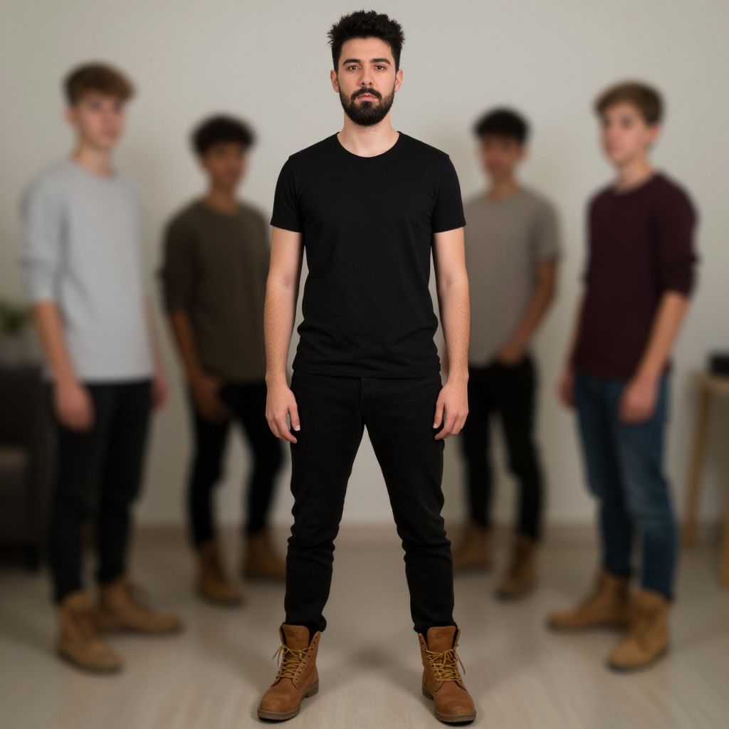 Photograph of a bearded man with short, dark hair standing front and center, wearing a black t-shirt, black pants, and brown boots. He has a medium build and a serious expression. In the blurred background, four men of varying ethnicities and builds stand in a line, wearing casual clothes like grey and white long-sleeve shirts, and dark pants. The background is a plain, light-colored wall with a light wooden floor. The focus is on the man in the foreground, with the background figures slightly out of focus.