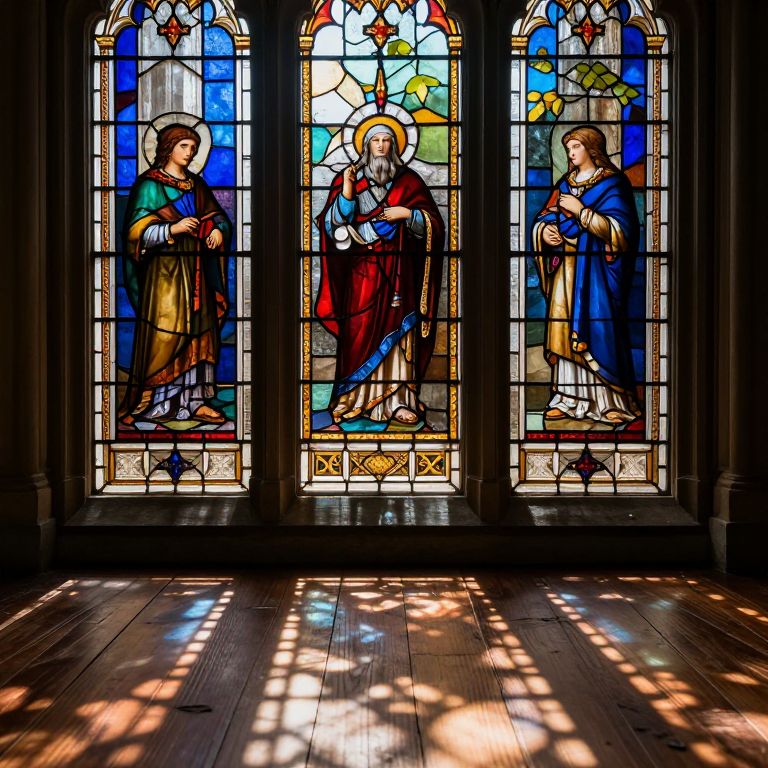 Photograph of a stained glass triptych depicting three religious figures in medieval-style robes. The central figure, with a halo, wears a red robe over a blue garment, holding a book. The left figure, in green and yellow, holds a scroll, while the right figure, in blue and brown, clasps hands. The glass is richly colored, with intricate patterns and symbols, set in a dark church interior. Sunlight filters through, casting colorful patterns on the wooden floor. The figures have serene expressions, and the scene is framed by dark, ornate wooden panels.