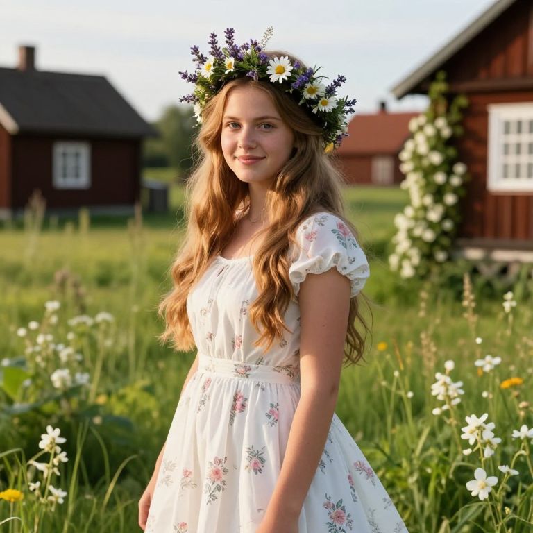 A beautiful Swedish midsummer girl with long, golden-brown hair and warm, friendly eyes stands in a sunny meadow during midsummer festival, wearing a white floral dress with a flowing skirt and a handmade flower crown made of fresh wildflowers like lavender and daisies, the background showing traditional Swedish wooden houses and blooming jasmine vines, natural sunlight casting soft golden light on her face and the field.