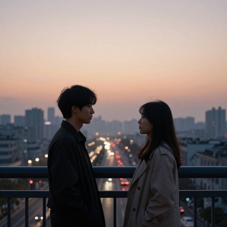 Photograph of a silhouetted Asian couple standing on a balcony at dusk, facing each other. The man on the left has short, dark hair and wears a dark jacket, while the woman on the right has long, dark hair and wears a beige coat. The background features a cityscape with blurred, glowing streetlights and buildings, and a gradient sky transitioning from orange to blue. The couple's profiles are outlined against the soft, evening light, creating a romantic and contemplative atmosphere. The balcony railing is visible in the lower part of the image.