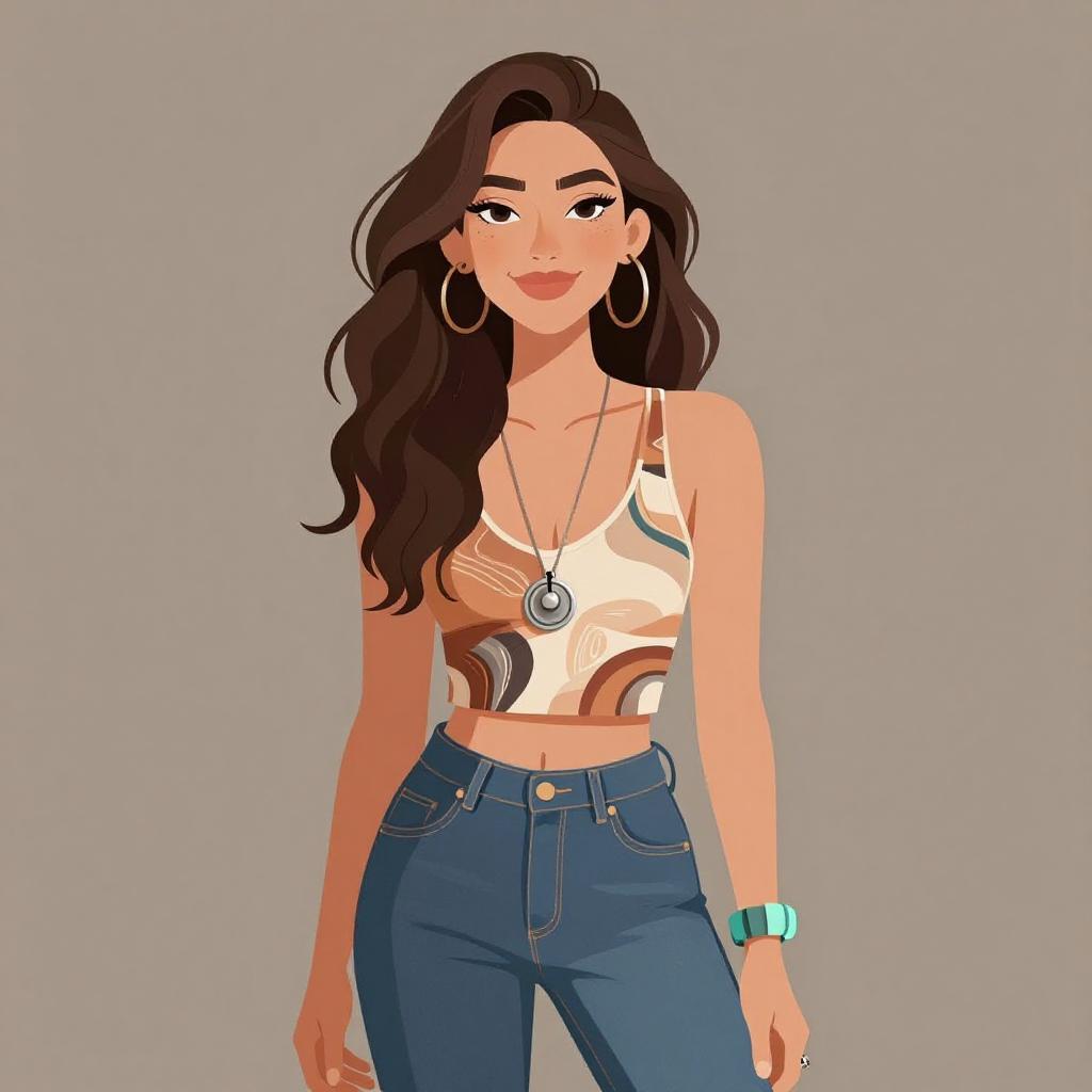 Woman with pretty face and pretty hair. smiling Woman, bohemian, brown patterned camisole top with ruffle detail, spaghetti straps, long pendant necklace with a circular white and silver design, fitted blue denim jeans, turquoise and silver cuff bracelet on her wrist. --sref 1467