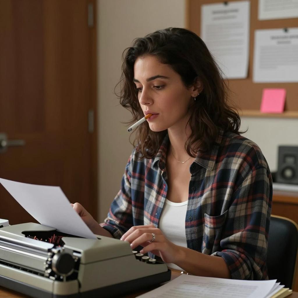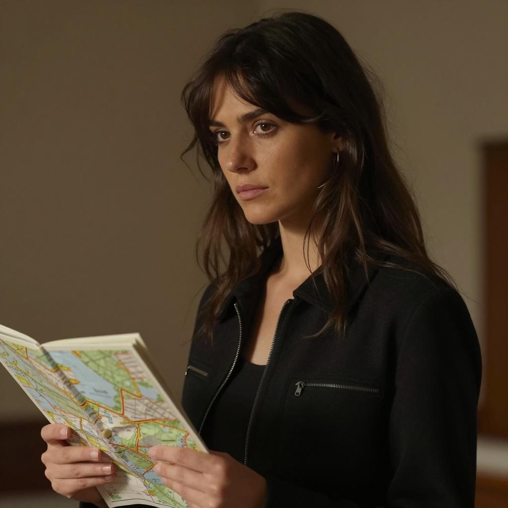 Young woman with short brown hair wearing a black shirt and dark jeans reclines against a wooden headboard with red cushions. She is holding a black corded telephone to her ear with a calm and focused expression, seated against a beige wall. She wears a delicate bracelet on her right wrist.