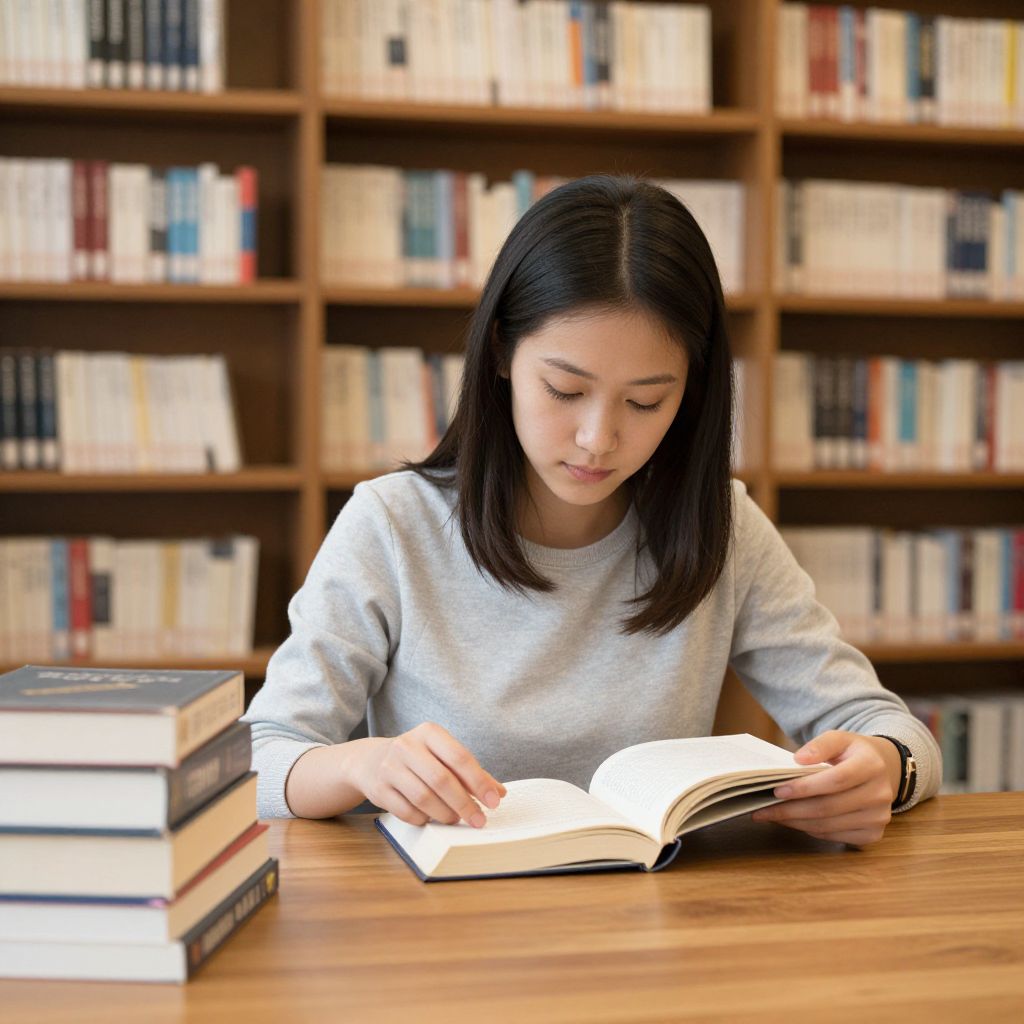 Asian woman with straight black hair, wearing a gray sweater, reading a book at a wooden table in a library. Stacked books beside her. Background