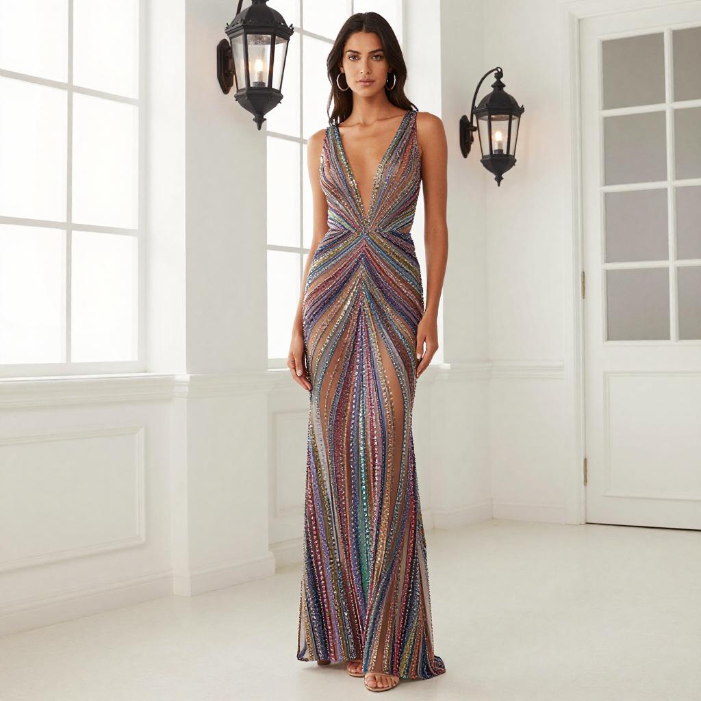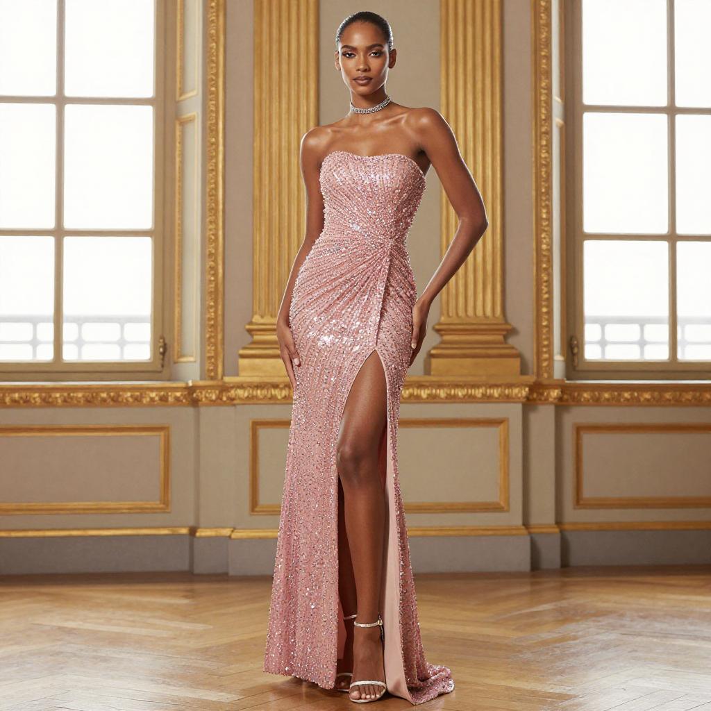 Photograph of a slender, dark-skinned woman with an elegant, high-fashion pose. She wears a strapless, pink, sequined gown with a high slit, revealing one leg. Her hair is slicked back, and she accessorizes with a choker necklace. She stands in a grand, opulent room with gold-trimmed walls and large windows. She wears strappy, silver high heels.