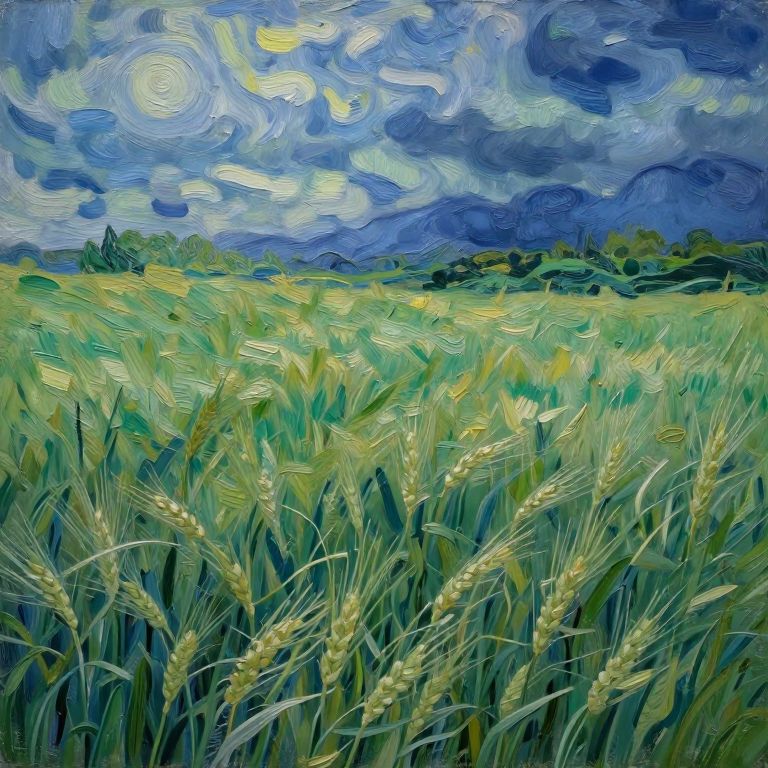 This is a vibrant, digital painting in an impressionist style, featuring a lush, green wheat field under a dramatic, swirling blue and white sky. The sun, partially obscured by cloud-like swirls, emits a bright, yellowish glow. The wheat stalks, with their golden, spiky heads, dominate the foreground, their detailed textures contrasting with the more abstract, brushstroke-heavy sky and background. The horizon line is faint, blending into a darker, tree-lined area, adding depth to the scene. The overall composition uses rich, bold colors and dynamic, swirling patterns to evoke a sense of movement and natural beauty.