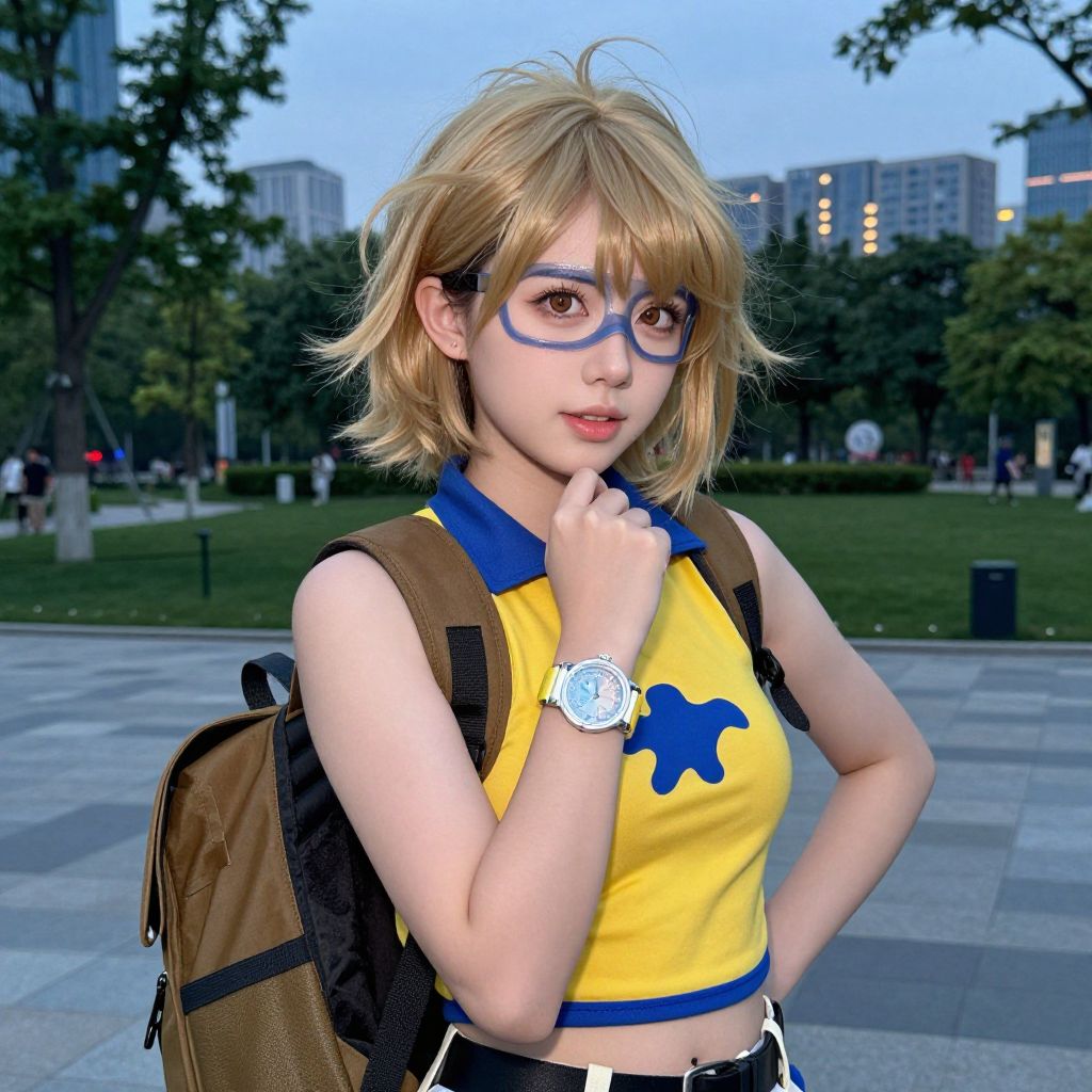 A vibrant and realistic cosplay scene featuring a teenage girl dressed as a spy from the 'Totally Spies!' series, wearing a yellow and blue outfit with a mask, a wristwatch, and a mission backpack, standing in a modern urban park at dusk with trees in the background and a glowing city in the distance, her face is youthful and lively with bright brown eyes and messy blonde hair, the costume is detailed with realistic fabric and accessories