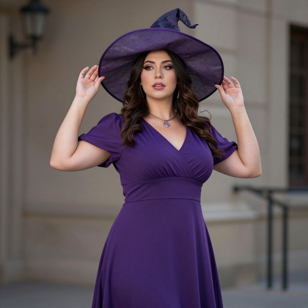 Photograph of a curvy woman with long dark hair, wearing a large black witch hat and purple dress, standing outdoors with a neutral background.