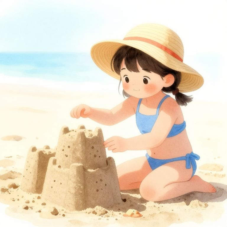 Chubby girl with short hair enjoying a beach day, wearing a bright swimsuit, playful waves in the background, sun shining, soft painterly style