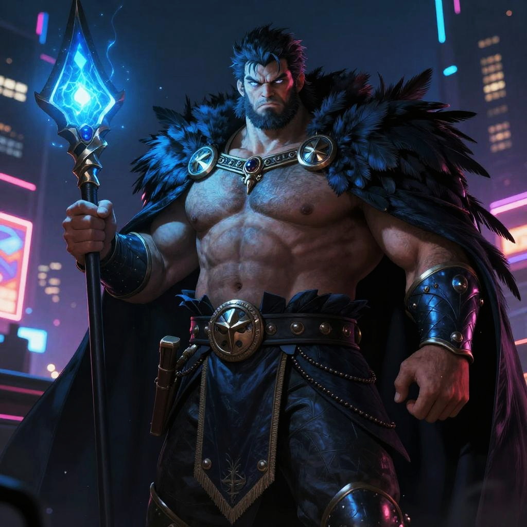 Raven team leader thick, an imposing figure in a dark feathered cloak, thick and sturdy physique, wielding a high-tech staff emitting blue energy, overseeing a covert operation at night, neon-lit cityscape background, artistic realism, strong shadows and highlights.
