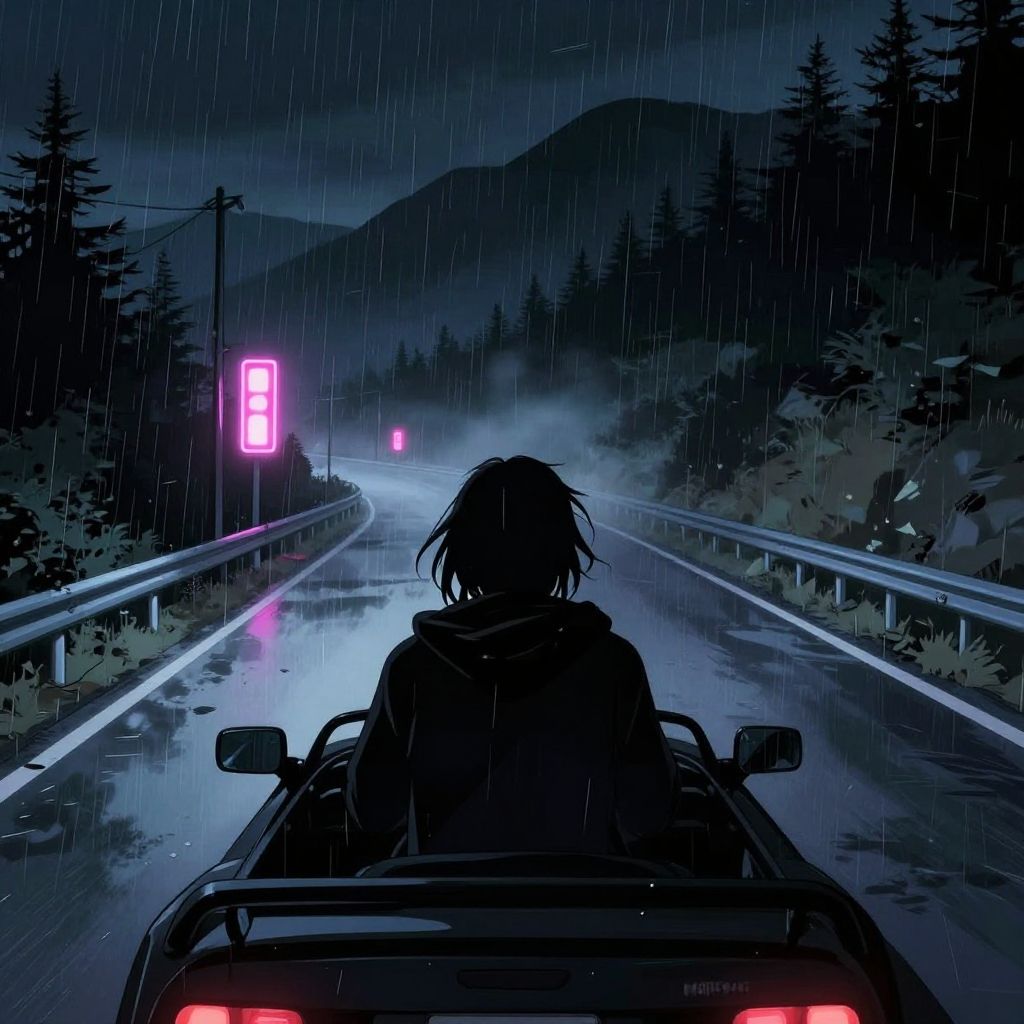 Digital anime-style drawing of a rainy night on a deserted road. A silhouetted figure with messy hair, wearing a hooded jacket, drives a car, facing away. The road has wet, reflective surfaces, flanked by tall trees and a guardrail. Neon pink and purple lights from two distant signs illuminate the misty, mountainous background. Raindrops are visibly falling, adding a textured, atmospheric effect. The scene evokes a sense of mystery and solitude.
