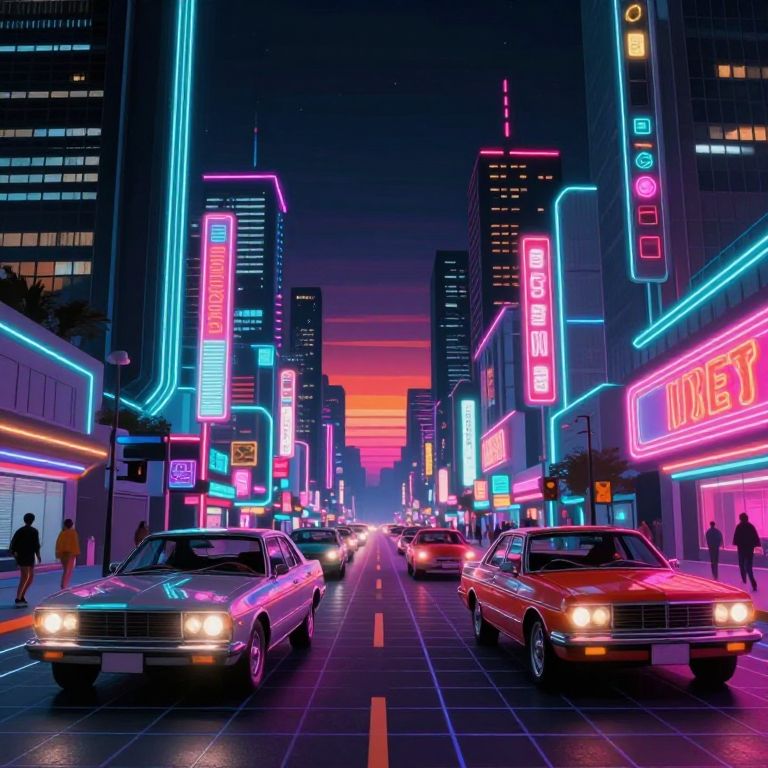 Digital anime-style artwork of a person with messy hair driving a car at night on a wet, rain-slicked road, illuminated by neon signs and