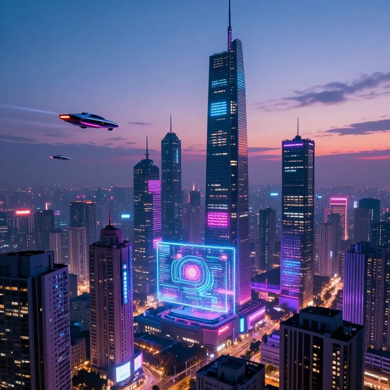 Image of art illustrating a futuristic cityscape with neon lights, towering skyscrapers, and flying vehicles at dusk, a cyberpunk aesthetic with electric blues and pinks, emphasizing technology and urban life in a highly detailed composition.