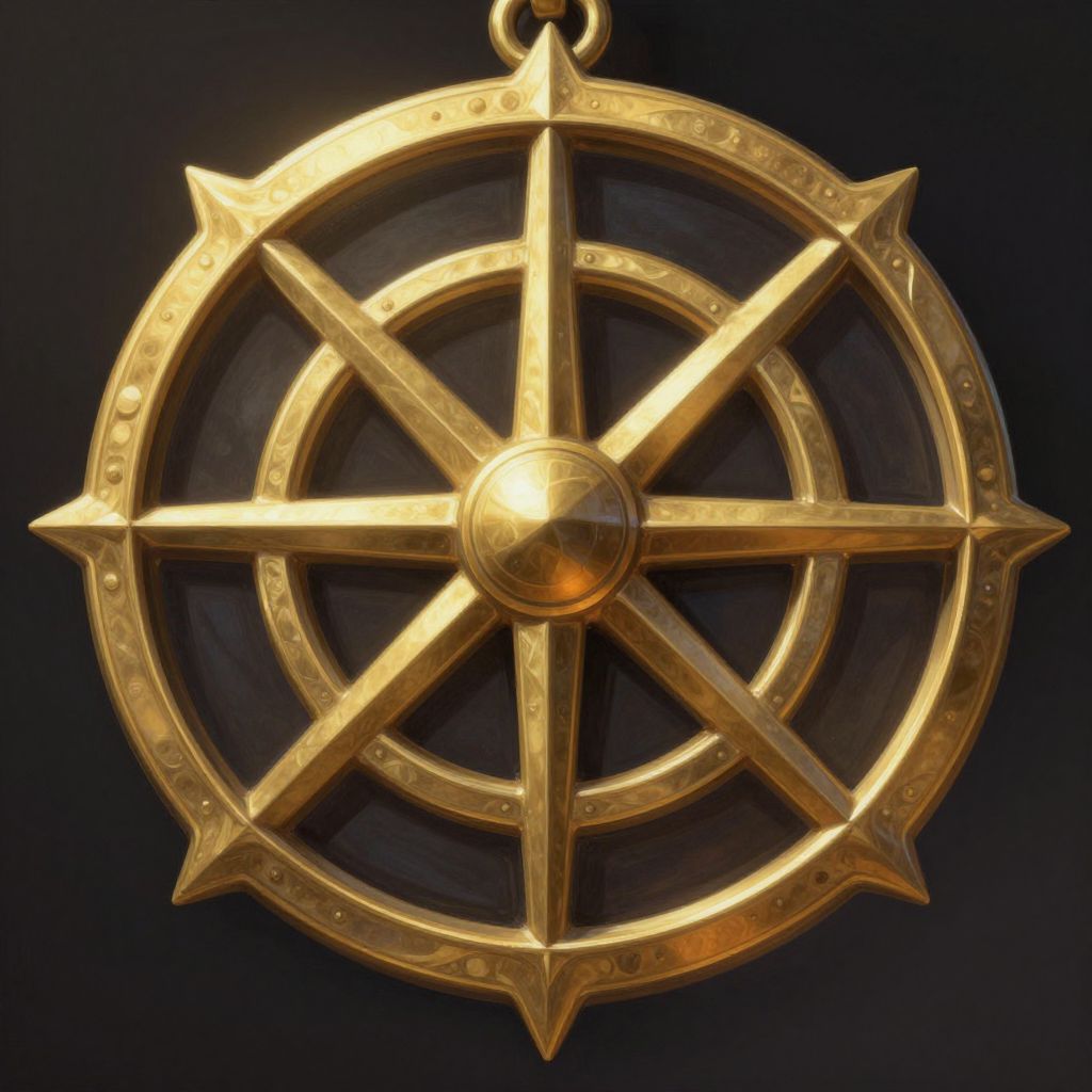 Photograph of a golden, metallic ship's wheel-shaped pendant with a central circle and cross arms, set against a dark background.