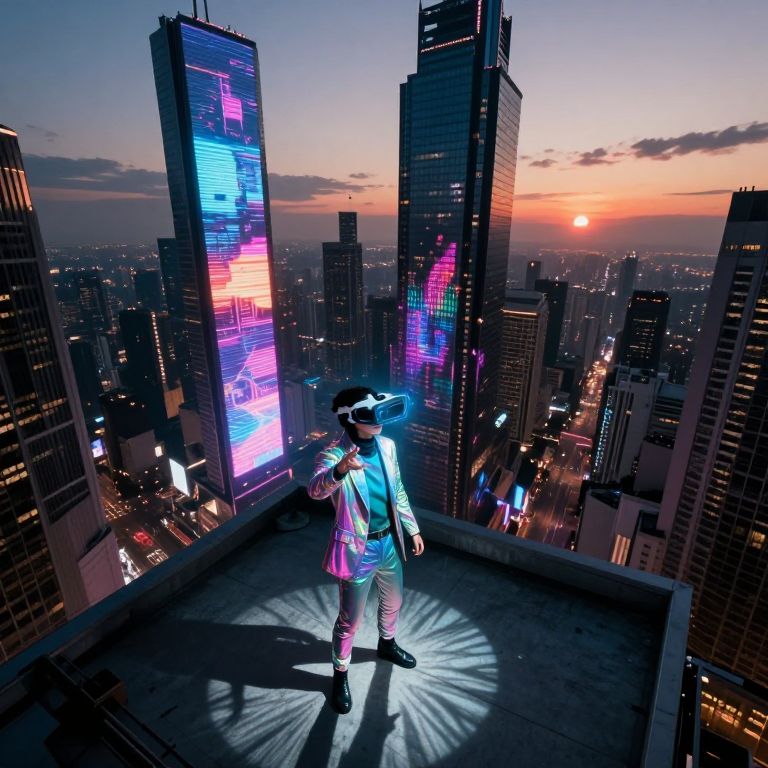 An aerial perspective reveals a vibrant cyberpunk city at twilight, reminiscent of Blade Runner's iconic visuals. Towering skyscrapers are adorned with holographic billboards that cast intricate shadows on the ground below, creating a captivating interplay between light and darkness. In the foreground, an individual clad in a mesmerizing iridescent suit engages with an advanced virtual reality display projected onto the concrete, seamlessly merging the digital realm with the physical world. This scene evokes a sense of intrigue and fascination as the sun dips below the horizon over this dynamic, ever-changing urban landscape.