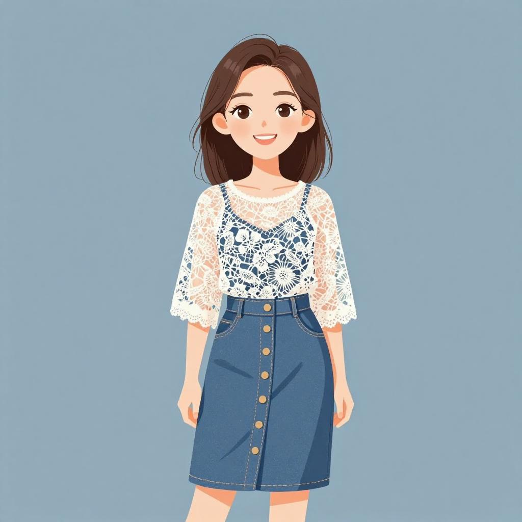 Digital illustration of a young woman with fair skin and long brown hair, smiling slightly. She wears a white lace long-sleeve top, a white fur vest, and a high-waisted blue denim skirt with button details. The background is plain white, making her outfit the focal point. The art style is clean and anime-inspired, with bold outlines and bright colors. Her expression is friendly and approachable.