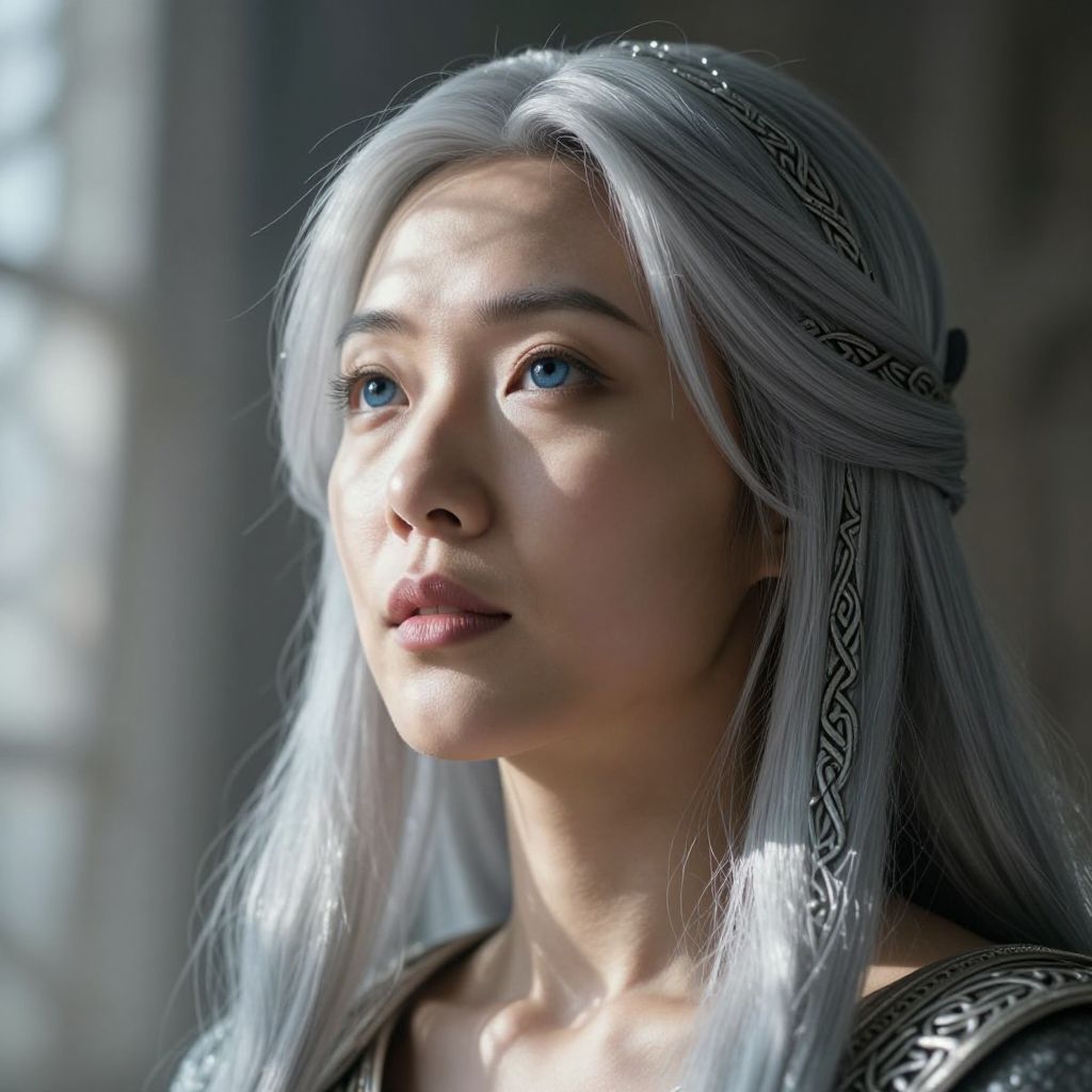 Envision a super-realistic portrait of an East Asian woman with cascading silver hair adorned in intricate Celtic patterns. Her gentle blue eyes, reflecting ancient wisdom, gaze off into the distance from a low angle. Ethereal light streams through a window, casting dappled shadows across her serene face and illuminating the sturdy contours of her ageless skin. The background is soft and dreamlike, subtly hinting at an untold story woven into the fabric of time. This captivating image captures both tranquility and depth, offering a glimpse into human experience.